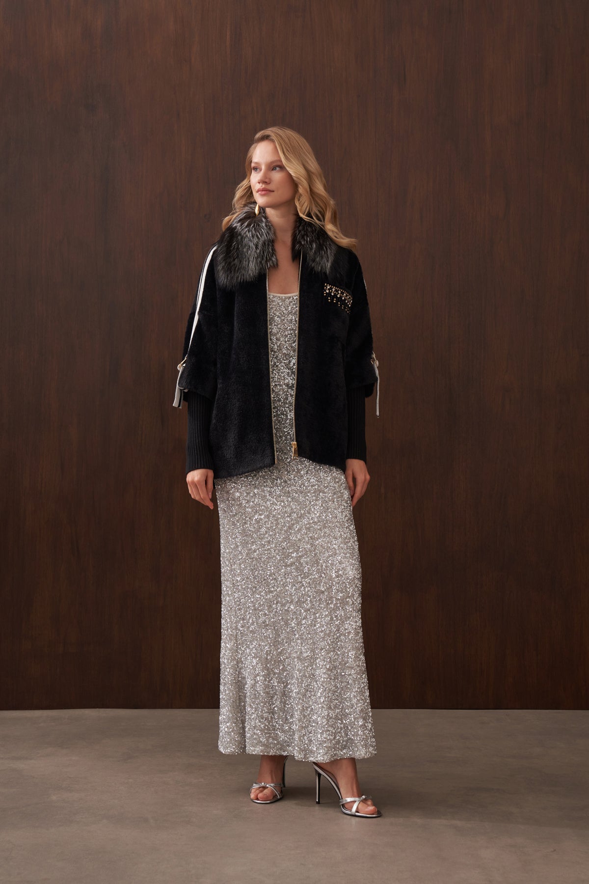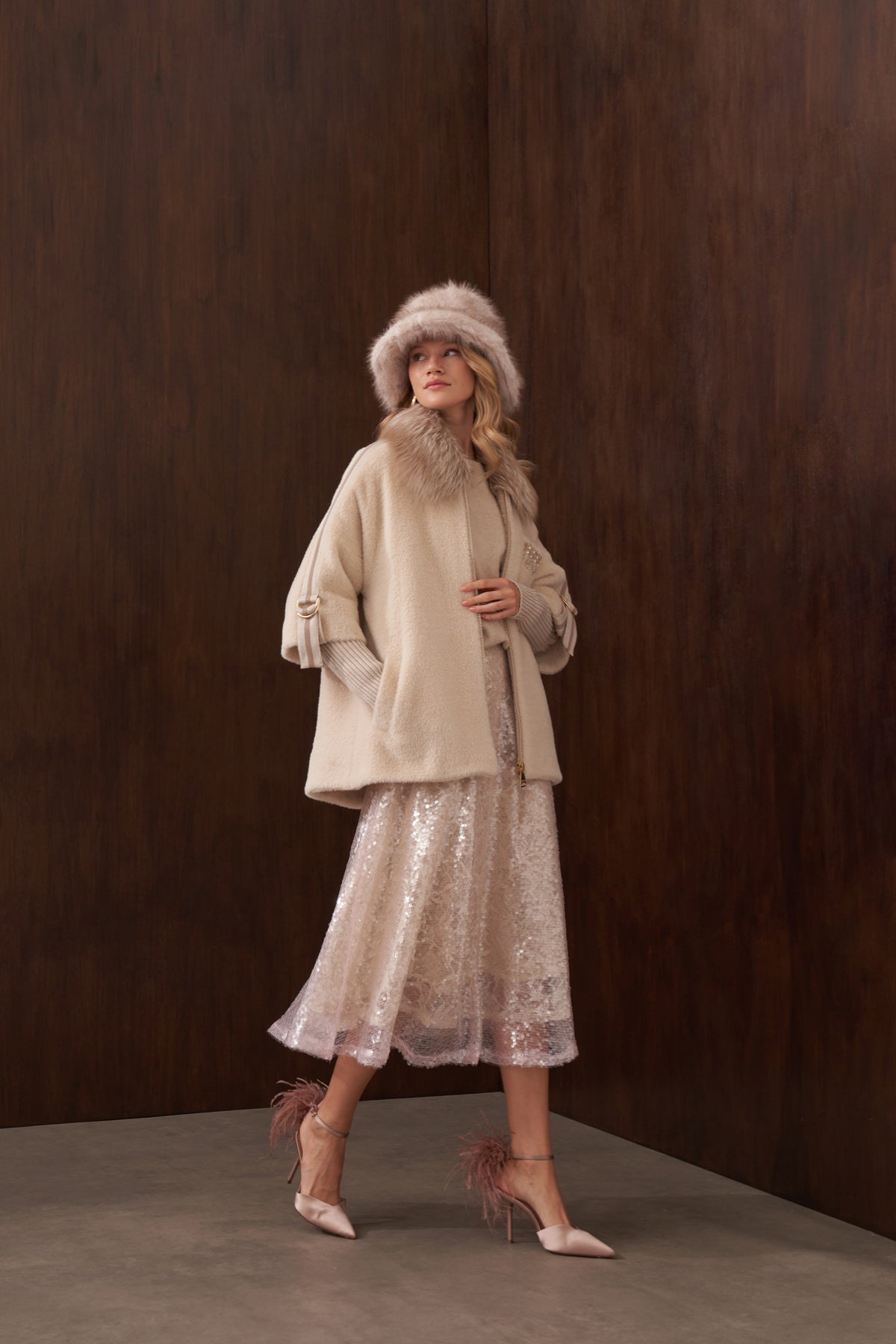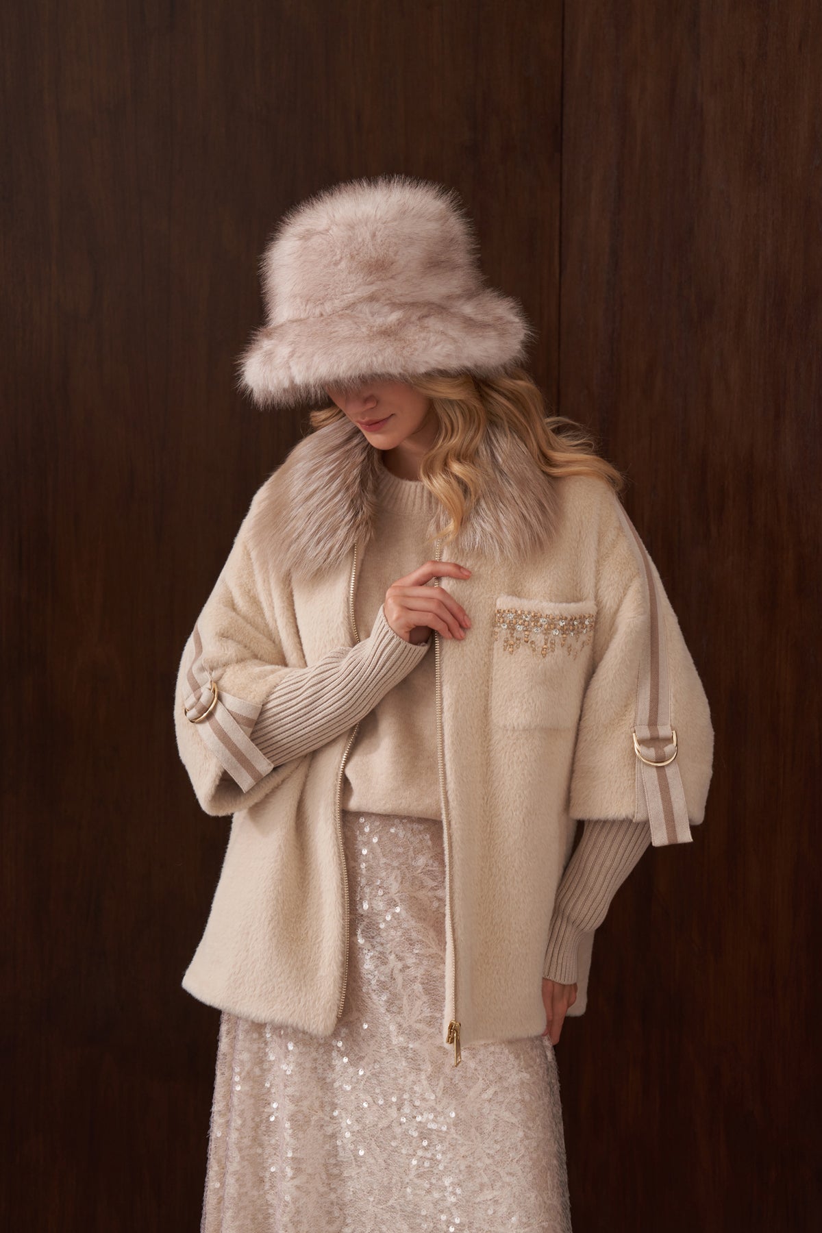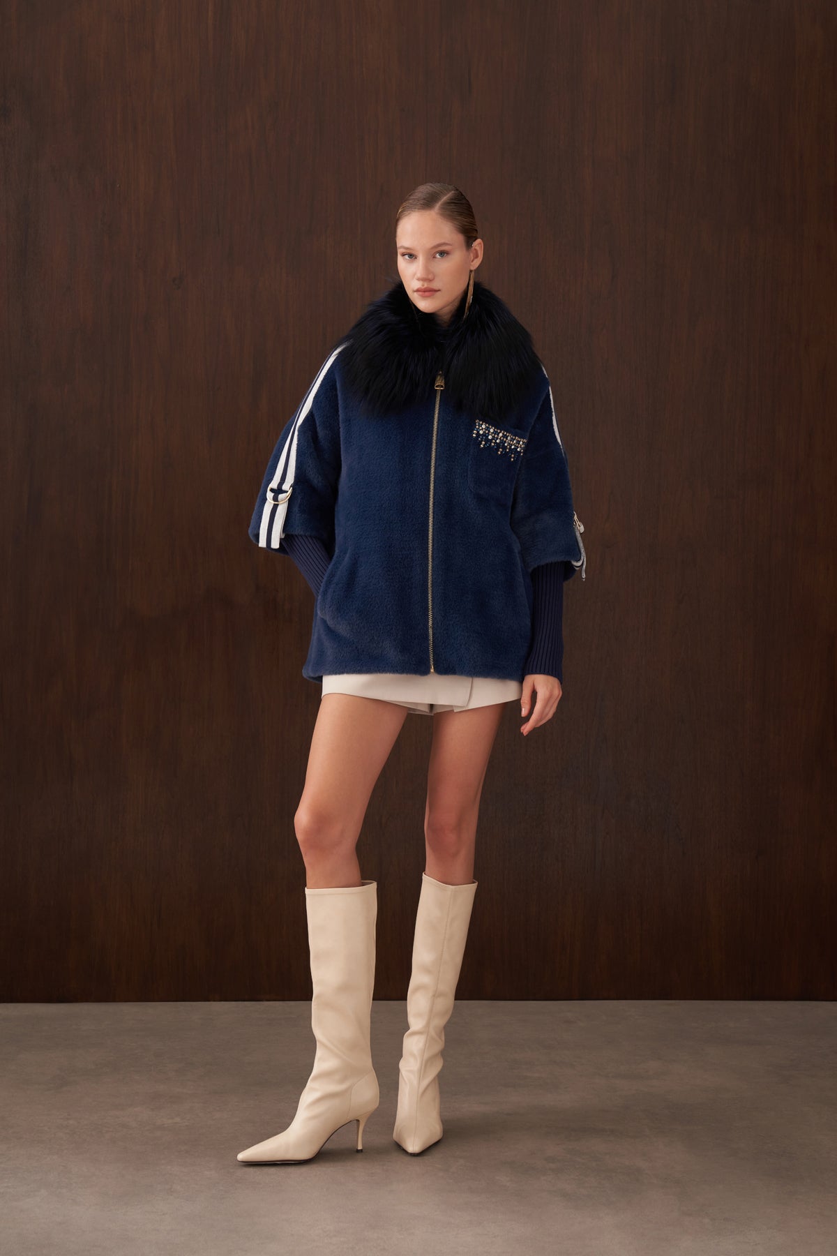 هذا المنتج مصنوع من قماش الأنجورا، وهو مبطن، ويتميز بياقة ثابتة من الفرو وجيوب أمامية مطرزة يدوياً، بالإضافة إلى جيوب جانبية.