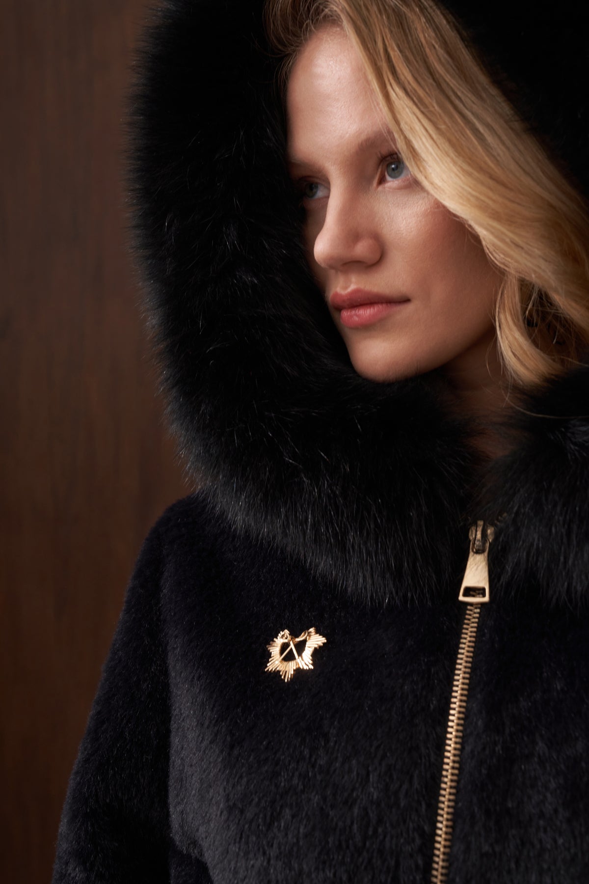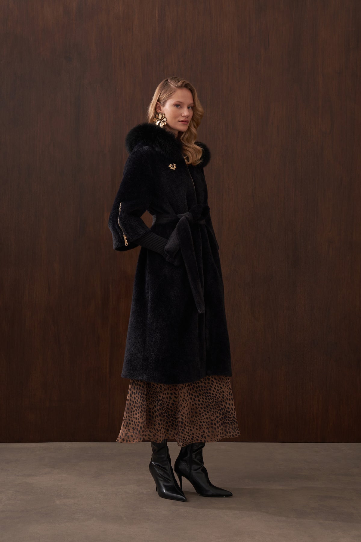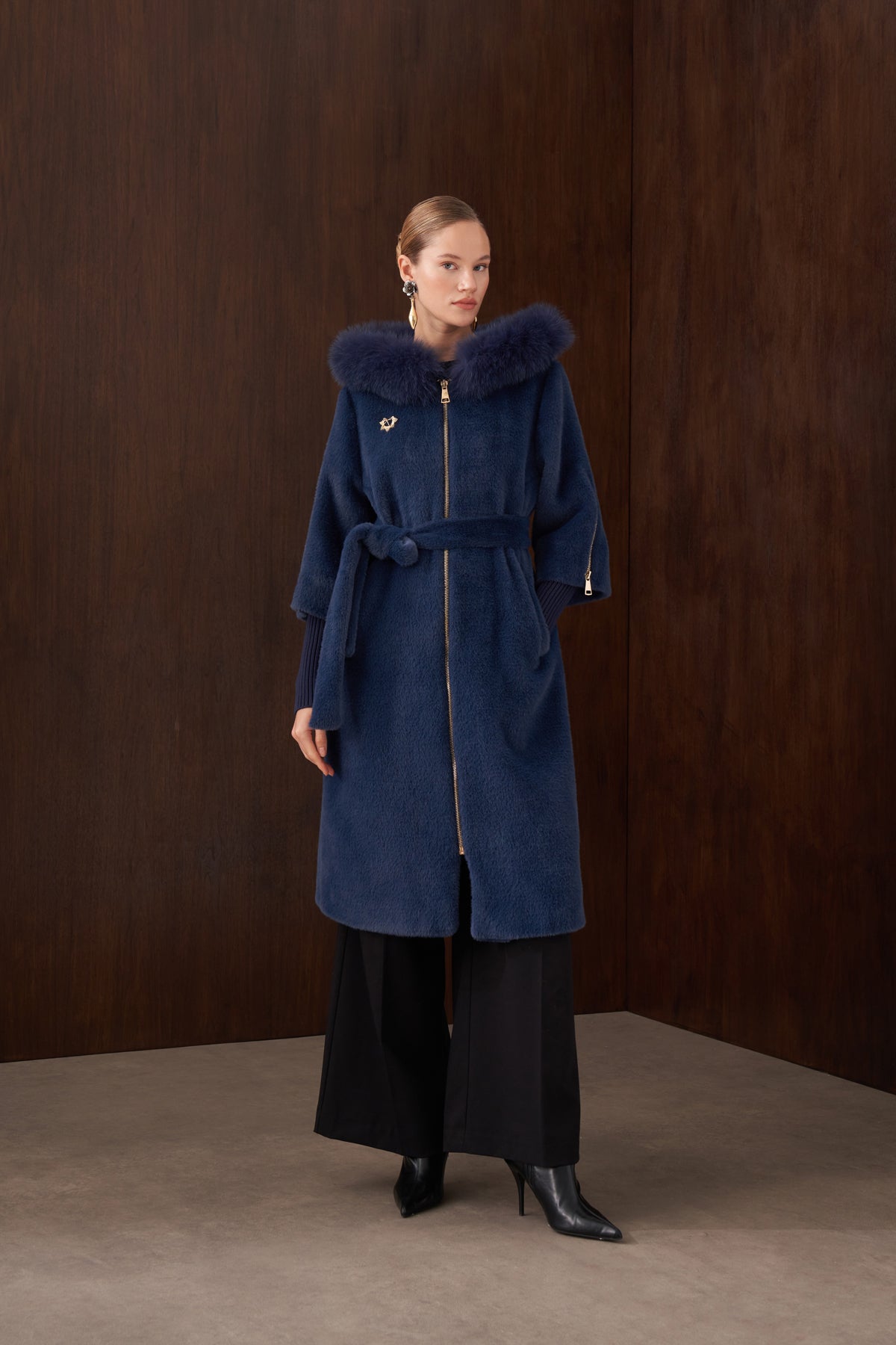 هذا المنتج مصنوع من قماش الأنجورا، ومبطن من الداخل، وتفاصيل الفرو ثابتة. يحتوي على بروش ذهبي اللون، وحزام قابل للفصل مصنوع من قماش الأنجورا أيضاً. كما يحتوي على جيوب جانبية. أما السحابات الموجودة على الأكمام فهي لأغراض الزينة فقط.