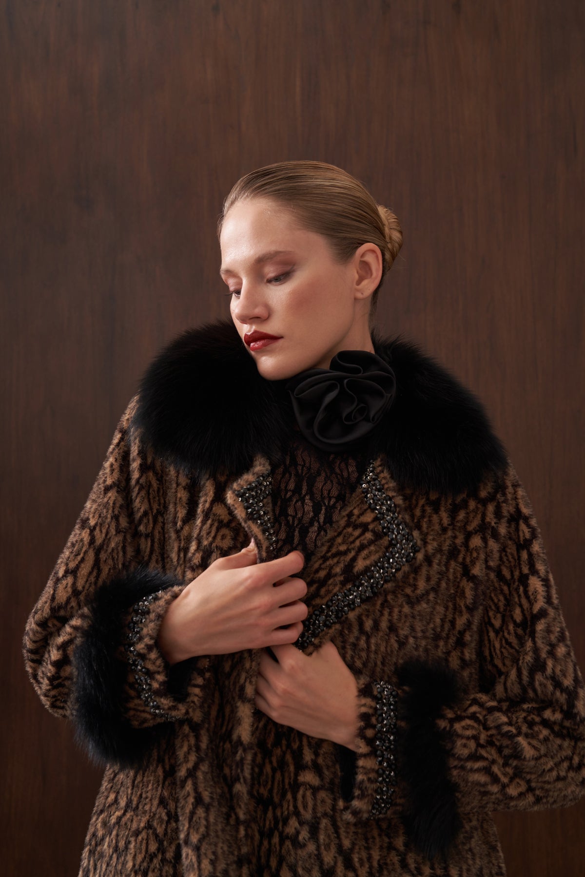 هذا المنتج مصنوع من قماش الأنجورا، ومبطن بالكامل باللون الأسود. يتميز بحواف من الفرو الثابت على الياقة والأكمام، وتفاصيل مطرزة يدويًا على الجيوب. كما يحتوي على جيوب جانبية. ويأتي معه حزام قابل للفصل مصنوع من قماش الأنجورا.