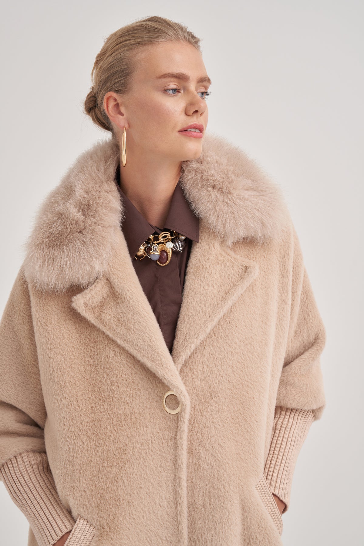هذا المنتج مصنوع من قماش الأنجورا، ومبطن من الداخل، ويمكن إزالة تفاصيل الفرو. كما أن الجيوب والأكمام مزينة بتفاصيل محبوكة، ويحتوي على حزام قابل للفصل مصنوع من قماش الأنجورا.