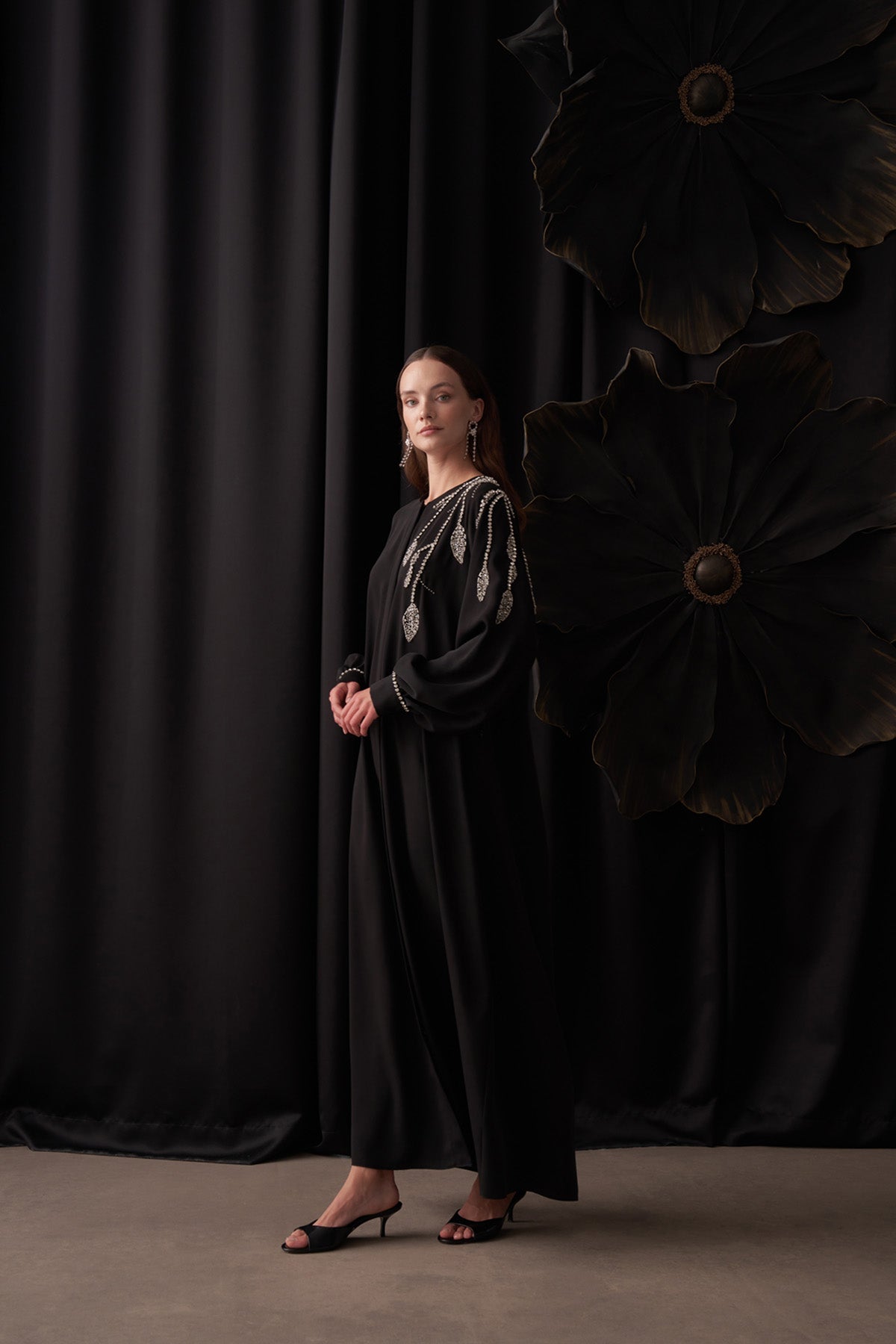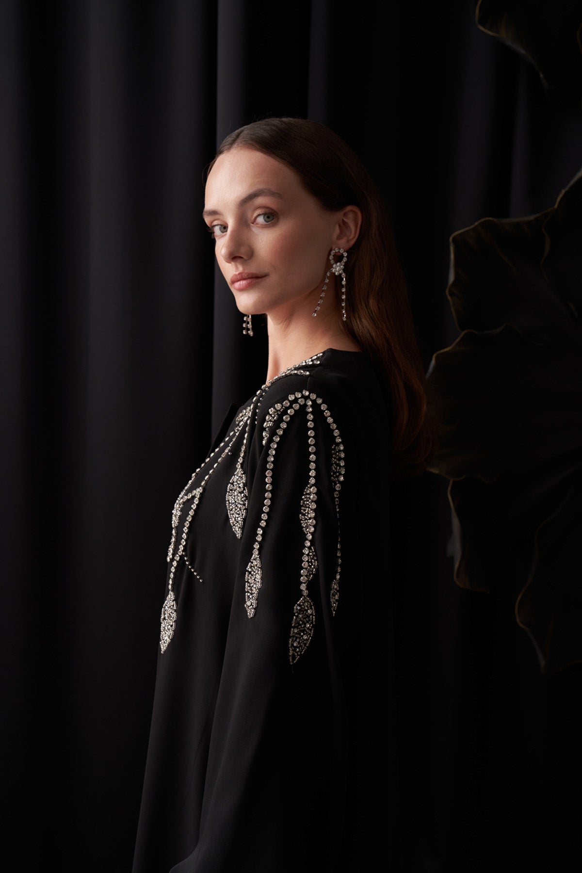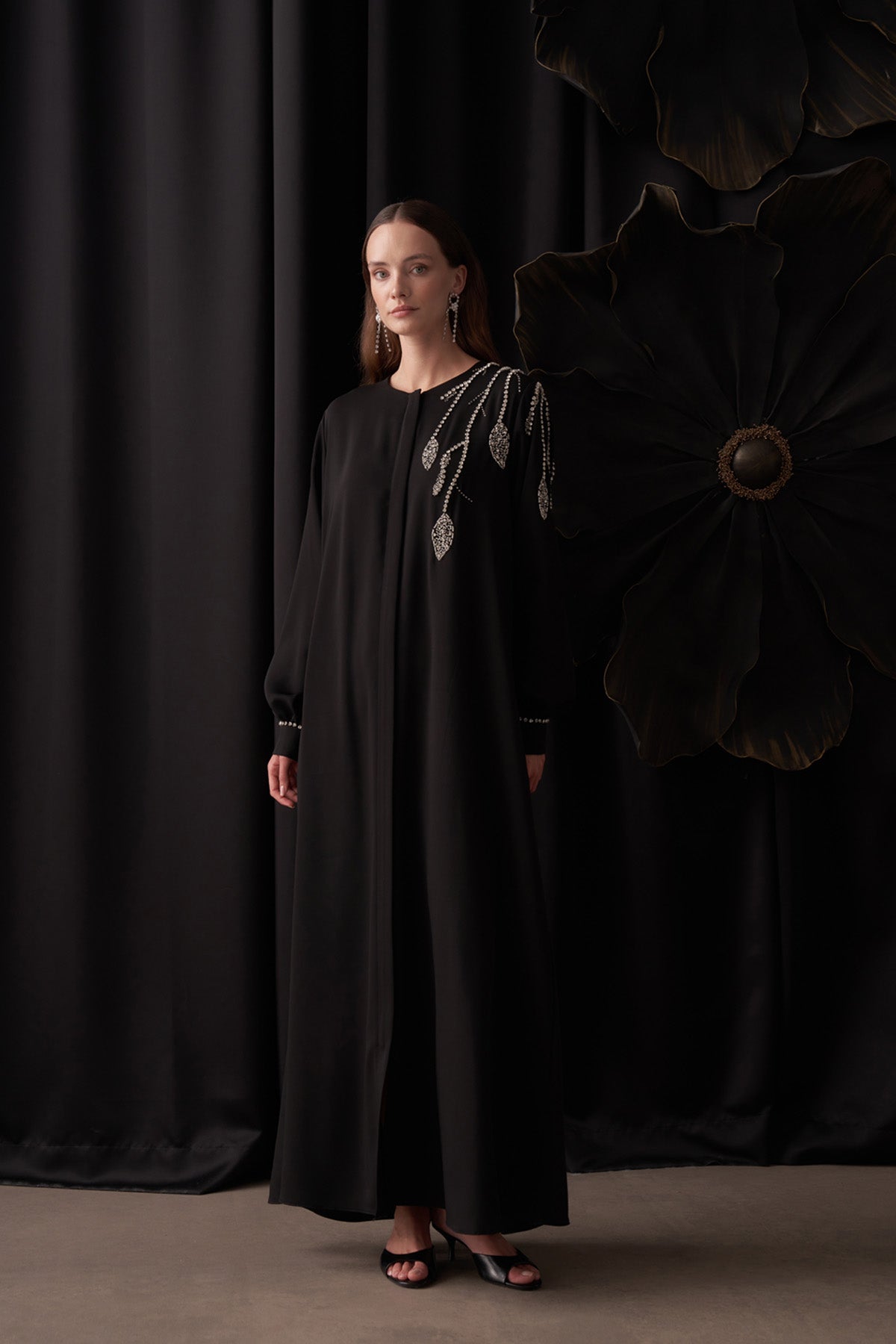 منتجنا مصنوع من قماش الكريب. يتميز بسحاب أمامي كامل الطول وزرين على الأكمام. جميع الأحجار والخرز مطرزة يدويًا. المنتج غير مبطن وغير شفاف. يحتوي على جيوب جانبية بسحابات مخفية. قد تختلف ألوان المنتج قليلاً بسبب التصوير.