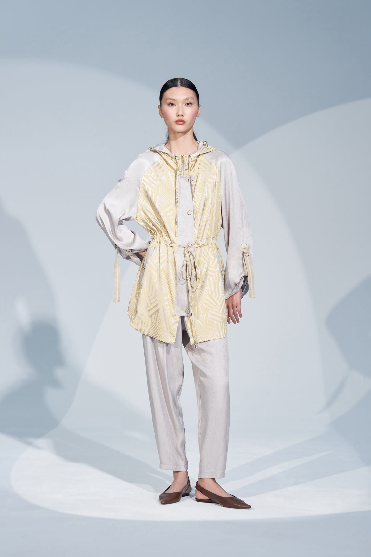 هذا المنتج مصنوع من قماش الجاكار. يتميز بسحاب أمامي وأزرار كبس. كما يحتوي على أربطة عند غطاء الرأس والخصر. أما البنطال، فيحتوي على أزرار كبس أمامية وحزام خصر مطاطي من الخلف. كل من السترة والبنطال مزودان بجيوب. منتجاتنا مصممة بقصة مريحة.