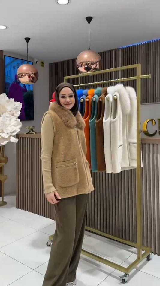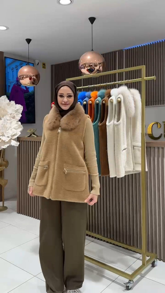 Kürk Detaylı Angora Kaban - Koyu Bej