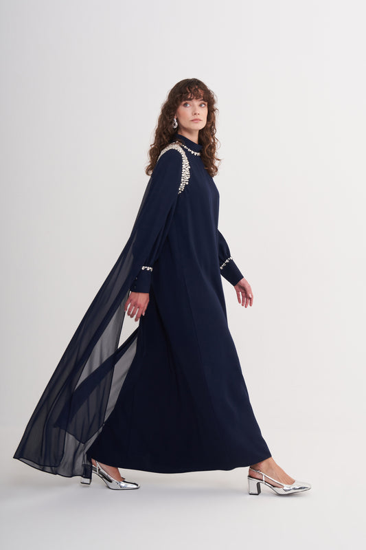 Omuz ve Yaka El İşi Taş İşlemeli Kol Pelerin Detaylı Elbise - Lacivert