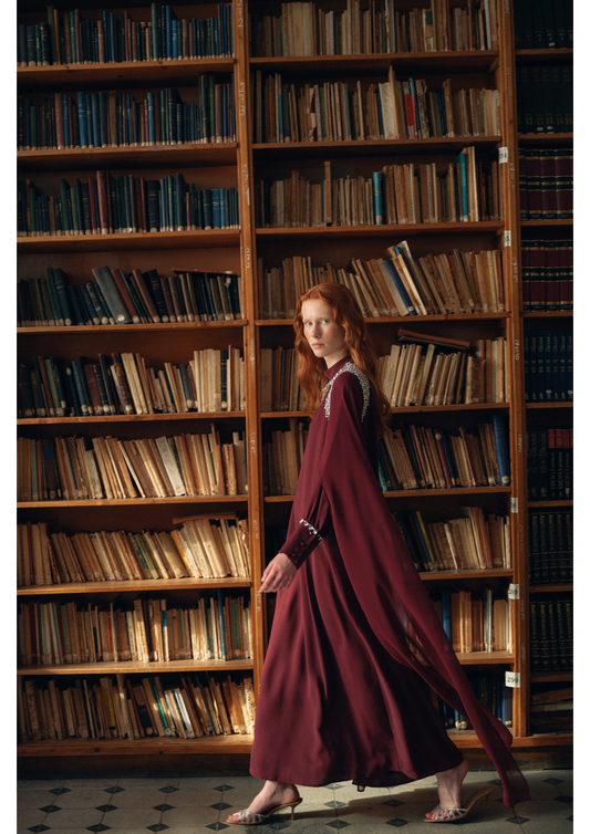 Omuz ve Yaka El İşi Taş İşlemeli Kol Pelerin Detaylı Elbise - Bordo
