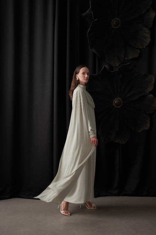 Omuz ve Yaka El İşi Taş İşlemeli Kol Pelerin Detaylı Elbise - Mimoza