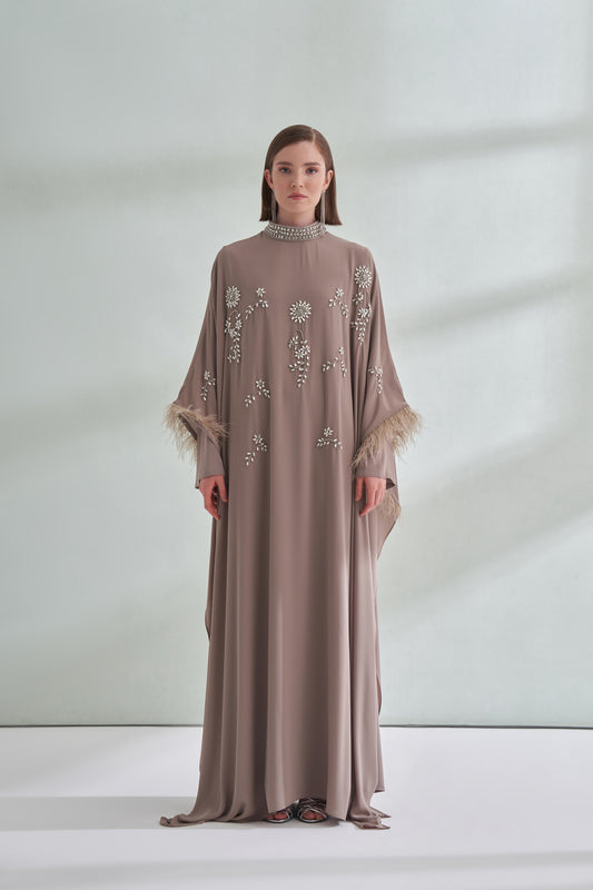 Taş İşleme ve Tüy Detaylı Pelerin Detaylı Elbise - Vizon