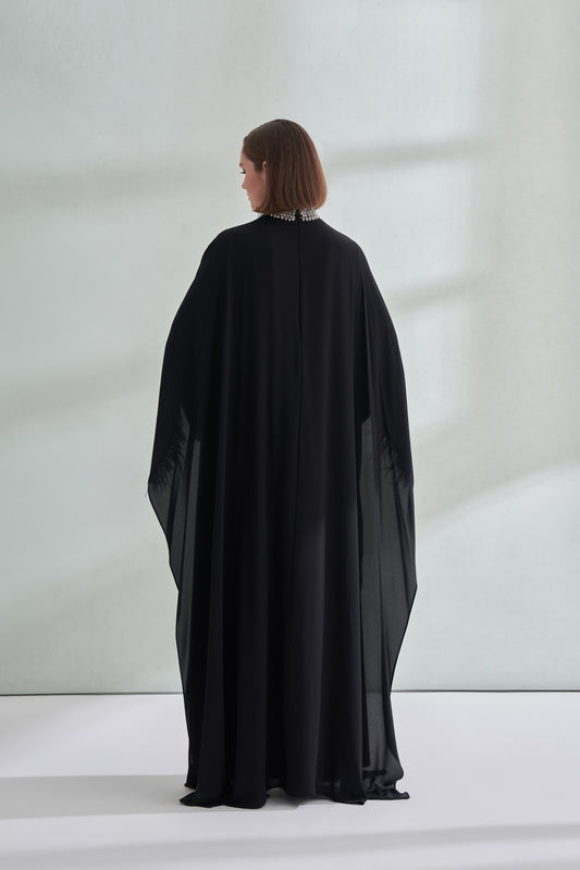 Omuz ve Yaka El İşi Taş İşlemeli Kol Pelerin Detaylı Elbise - Siyah