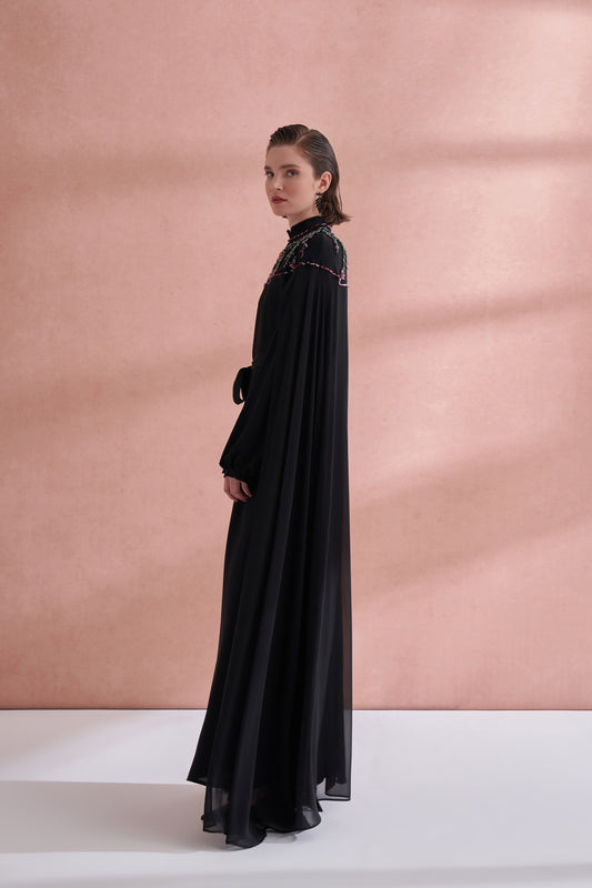 El İşi Çiçek İşleme Detaylı Pelerinli Elbise - Siyah