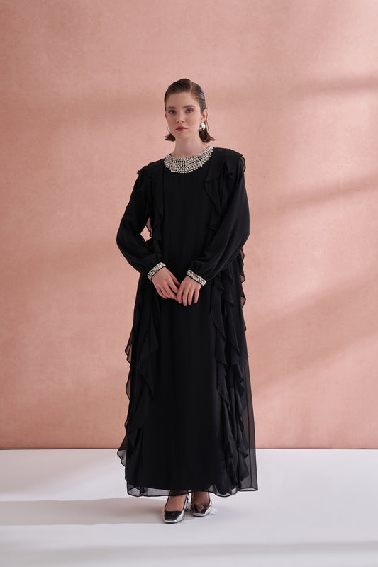 Kol ve Yaka Taş Detaylı Önü Boydan Fırfırlı Elbise - Siyah