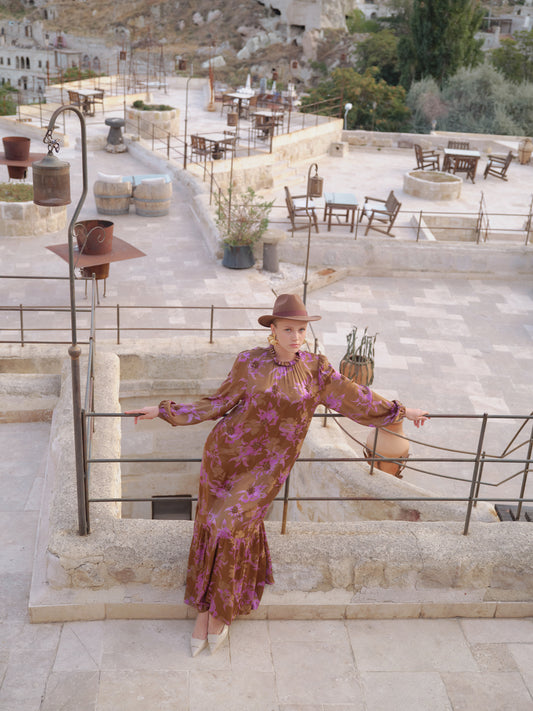 Çiçek Aksesuar Detaylı Şifon Elbise - Kahve