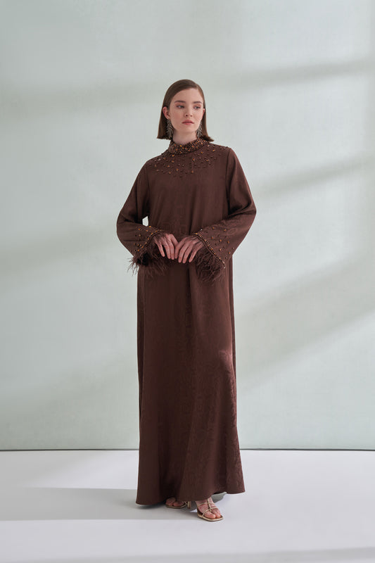 Taş ve Tüy Detaylı Jakarlı Elbise - Kahve