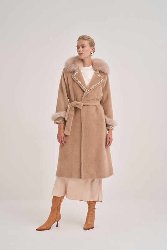 Kol ve Yaka Kürk ve Taş Detaylı Kaban - Koyu Bej