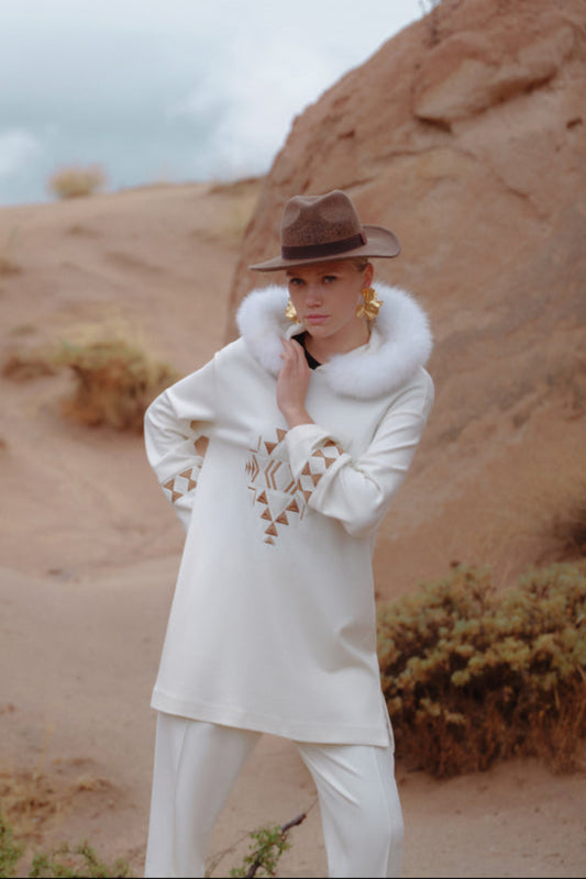 Etnik Desenli Kapüşon Kürk Detaylı Takım Elbise - Ekru