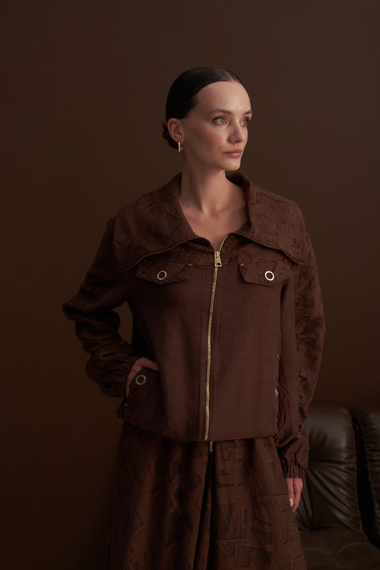 Kol Lastikli Ön Nakış Detaylı Ceket ve Etekli Takım - Kahve