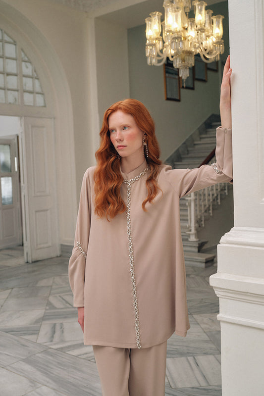 El İşi Taş Desenli Kol Büzgü Detaylı Takım - Vizon