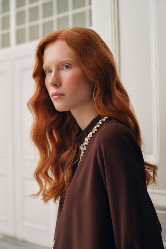 El İşi Taş Desenli Kol Büzgü Detaylı Takım - Kahve