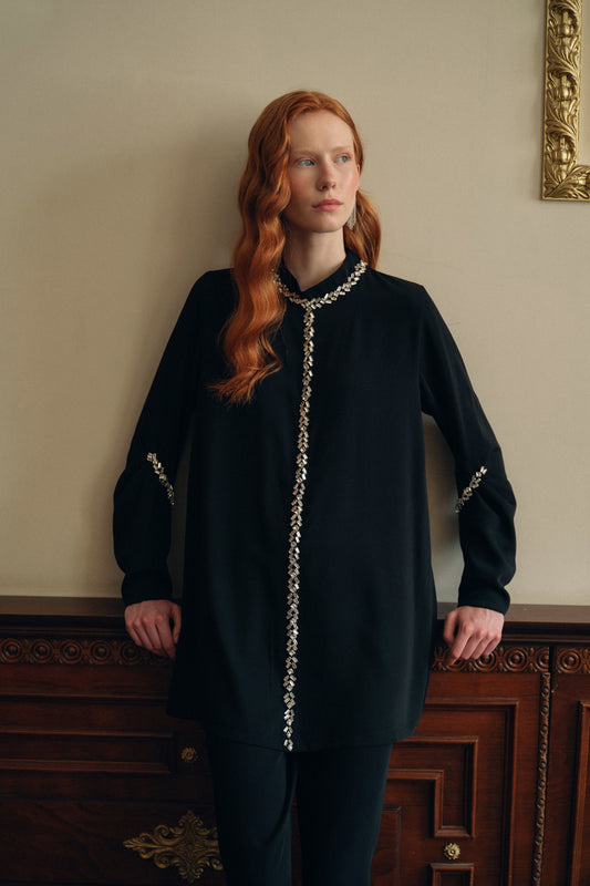 Ön Patlı ve Kollarda Boncuk İşleme Detaylı Takım - Siyah