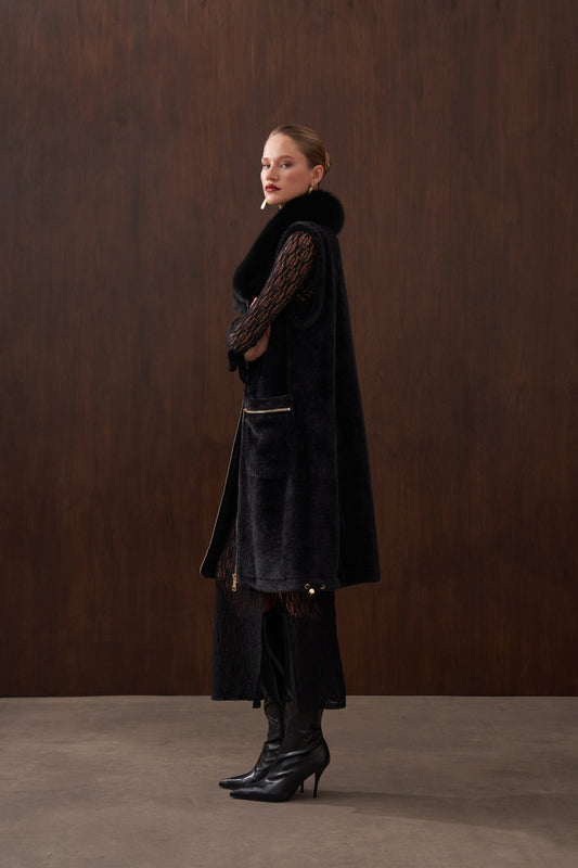Hakim Yaka Kürk Detaylı Fermuarlı Angora Kaban - Siyah