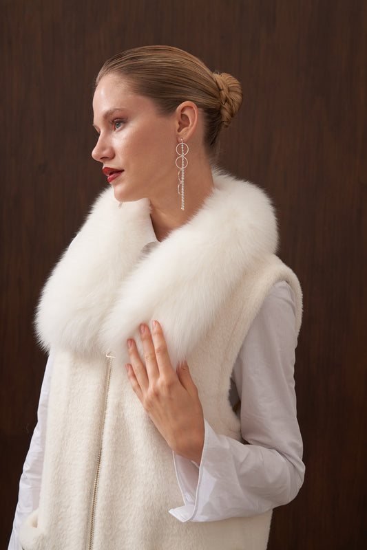 Fermuar ve Kürk Detaylı Angora Yelek - Ekru
