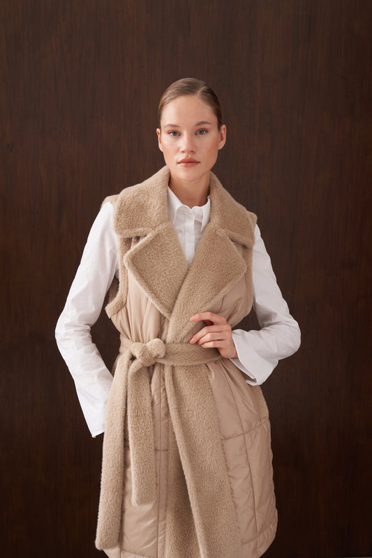 Kapitone ve Angora Kombinli Yelek - Koyu Bej