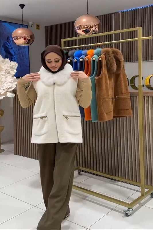 Kürk Yakalı Angora Yelek - Mint Yeşili
