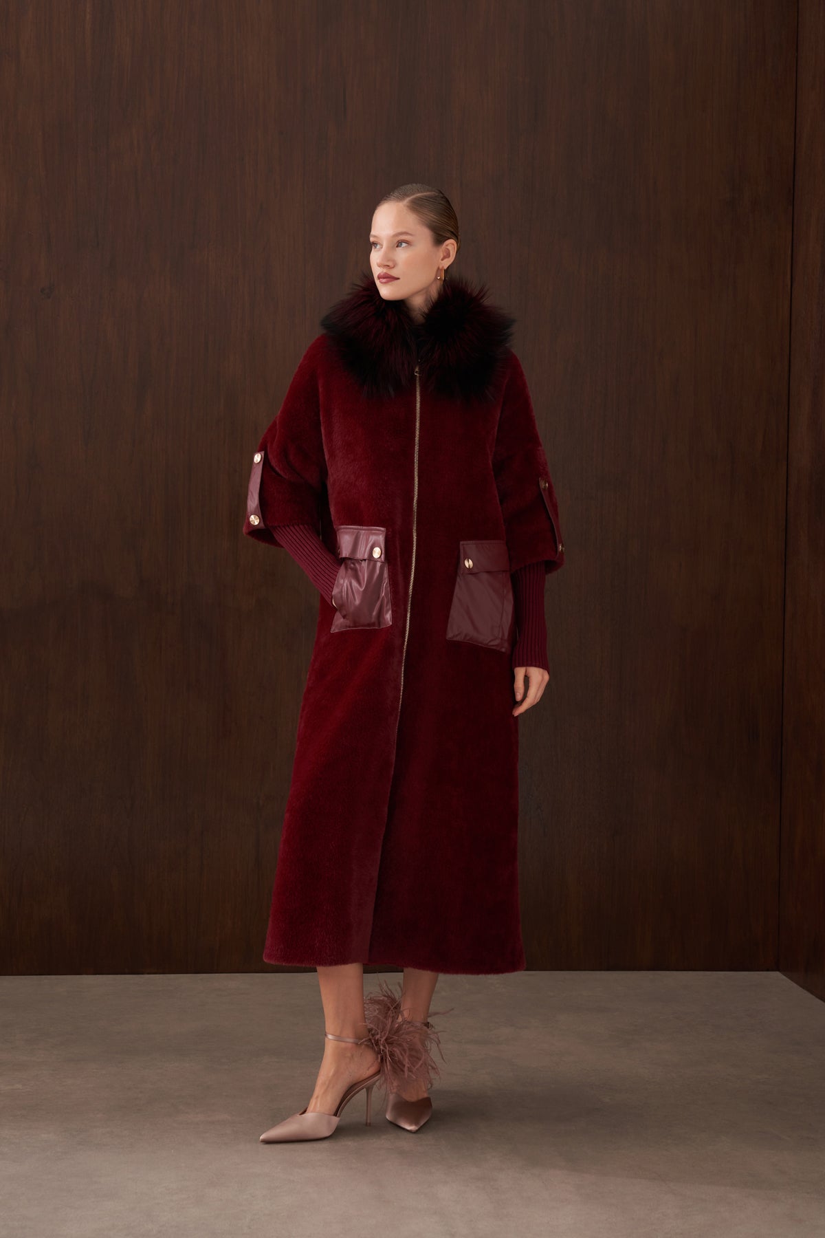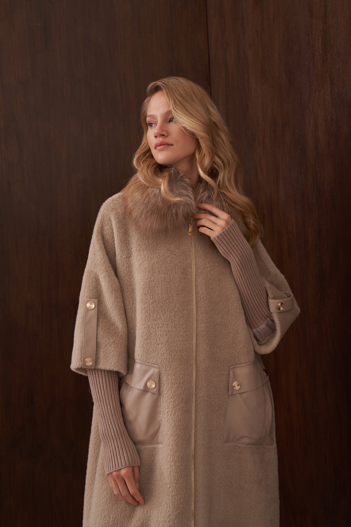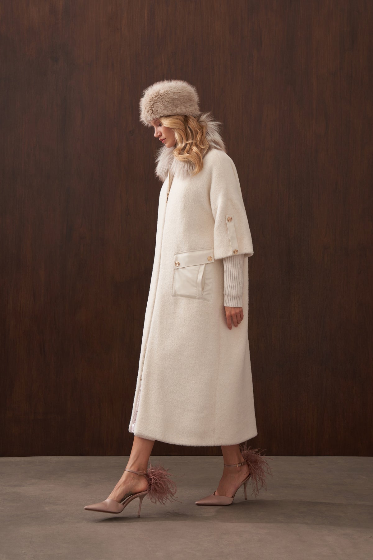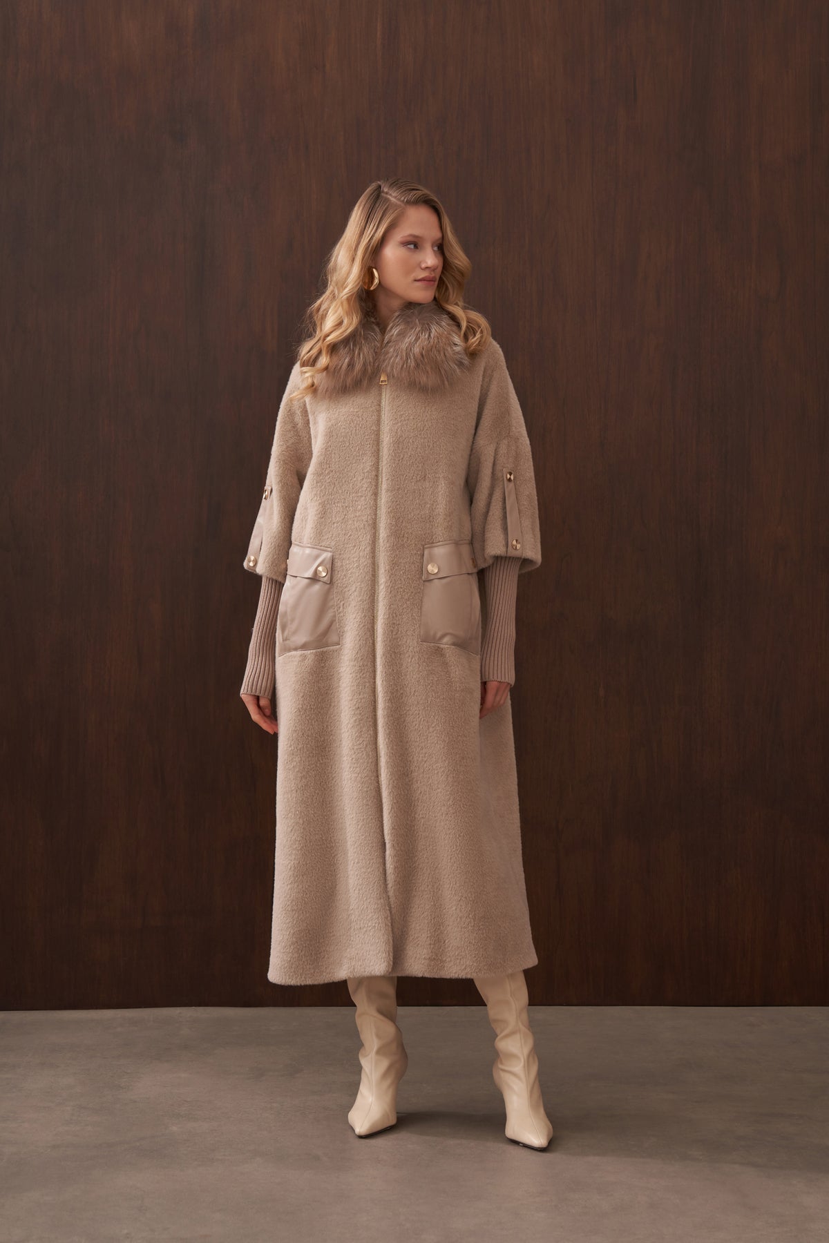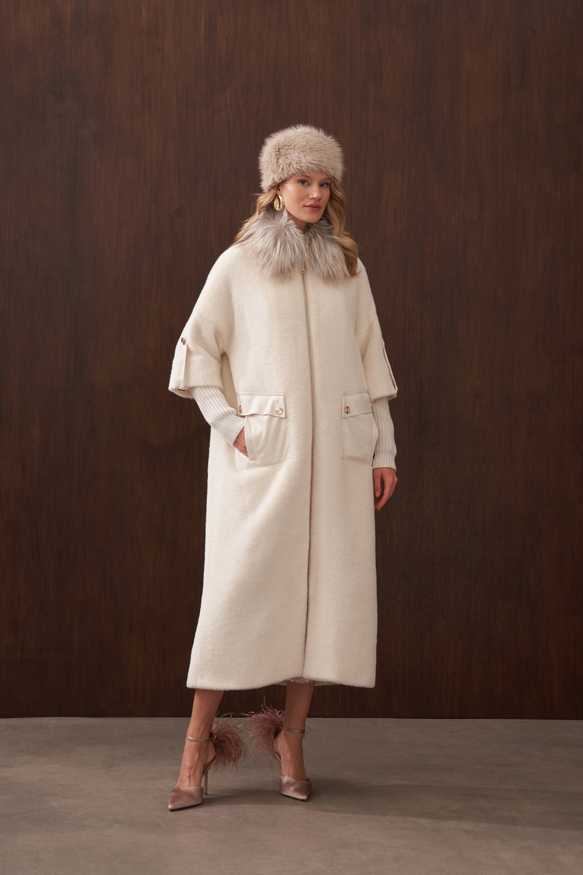 Ürün Angora kumaştan üretilmiştir. İçi astarlıdır. Kürk detayı ve apoletleri sabittir. Cep detayları çıtçıtlıdır , açılabilir. Angora kumaştan seyyar kemeri mevcuttur.