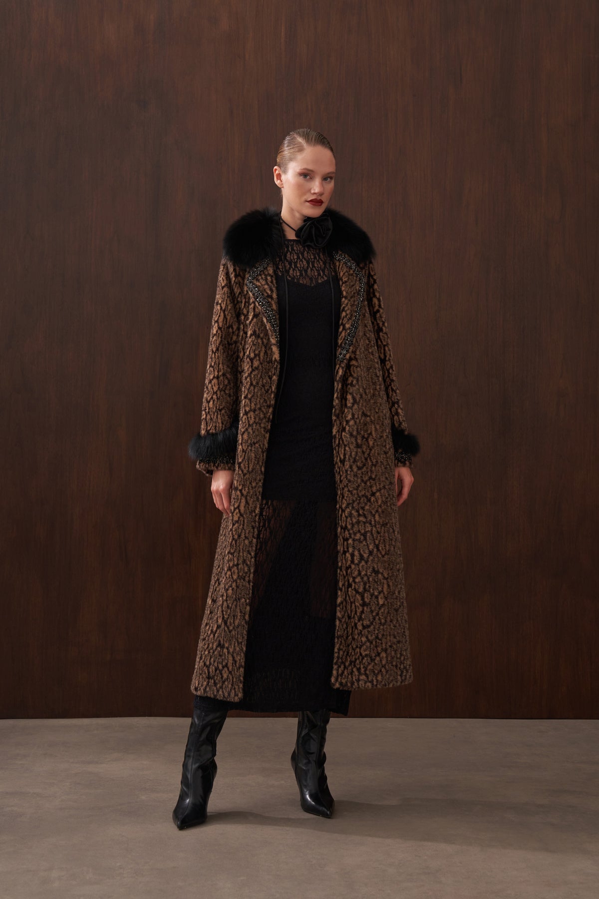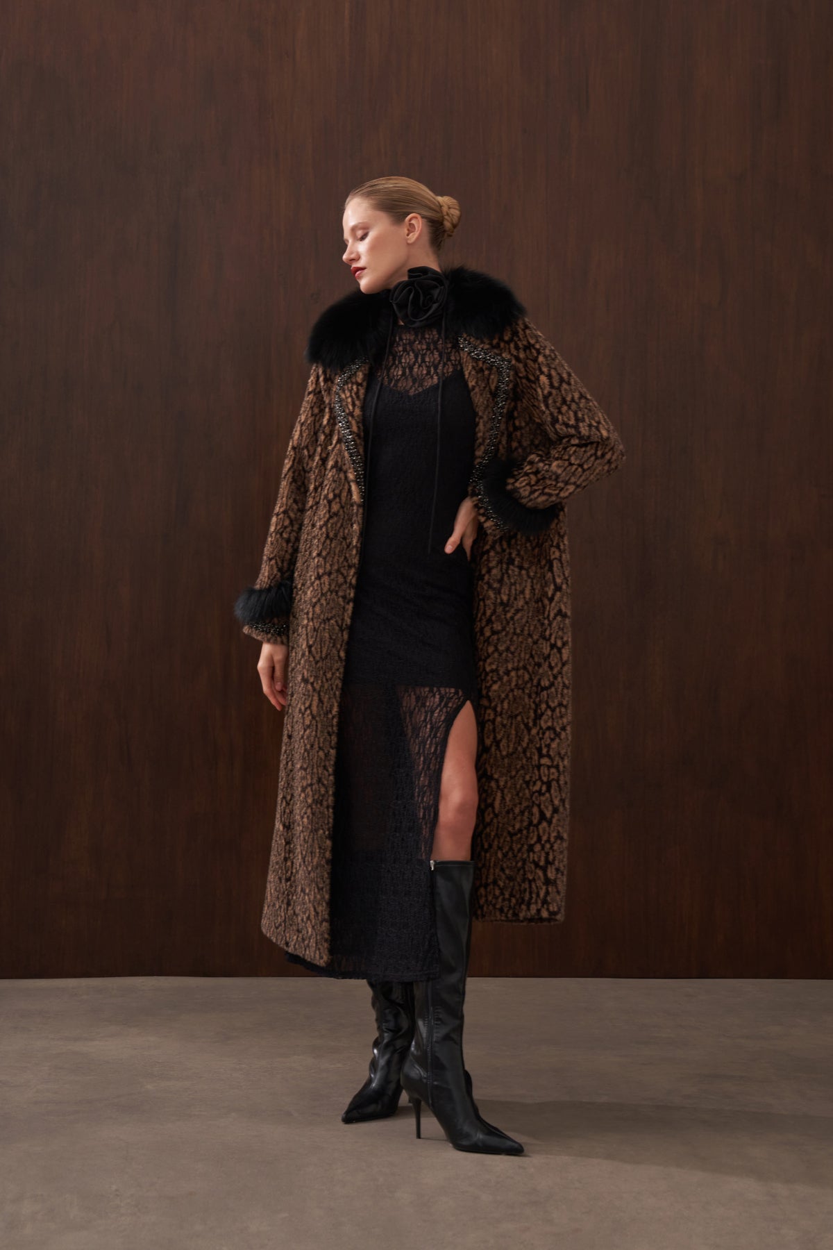 Kürk ve Elişi Detaylı Angora Leopar Kaban
