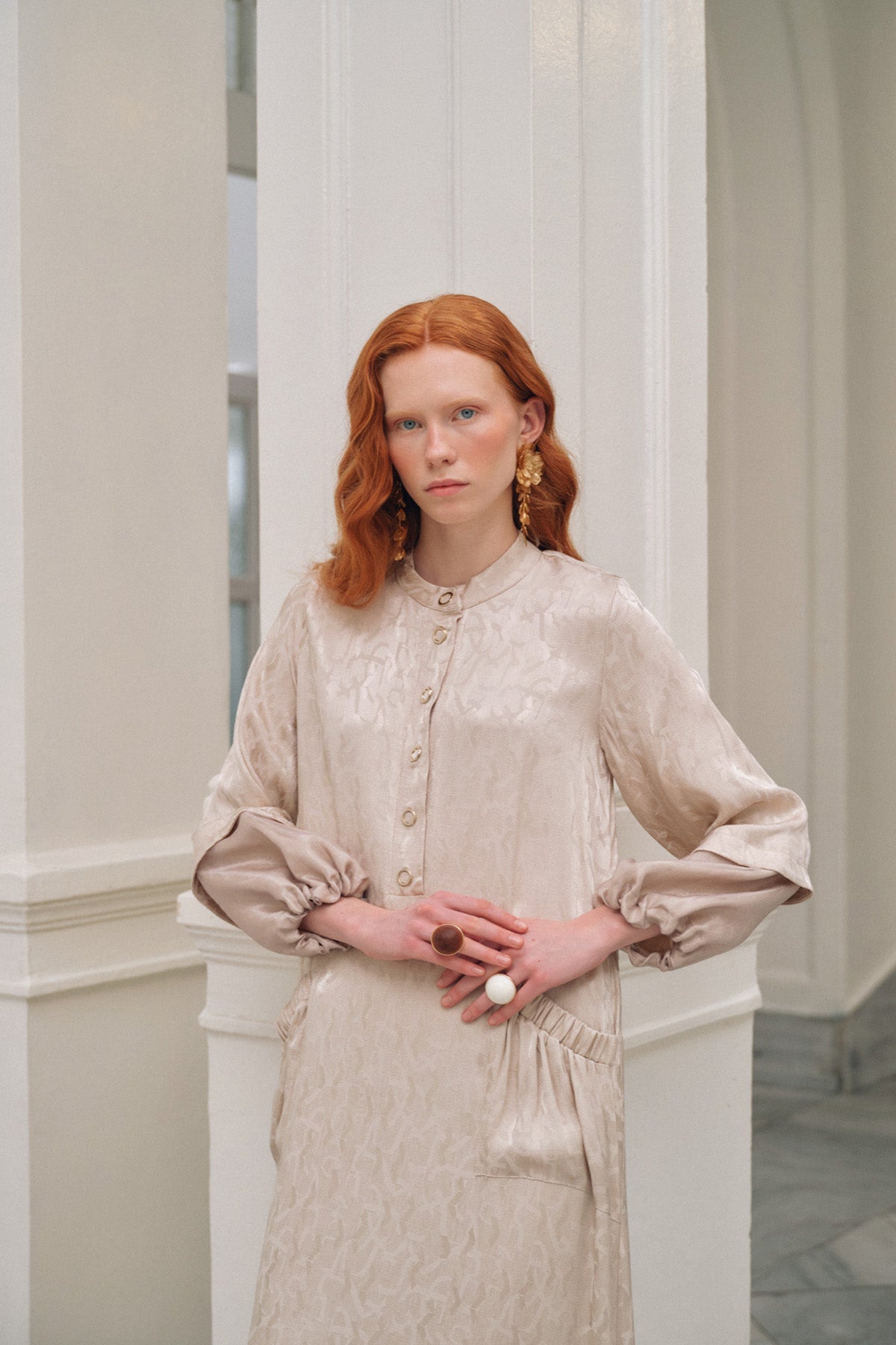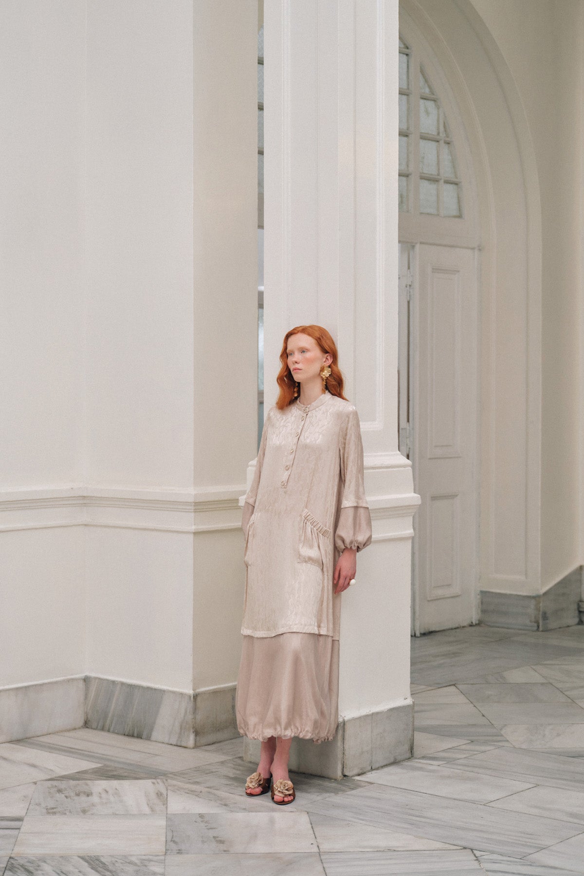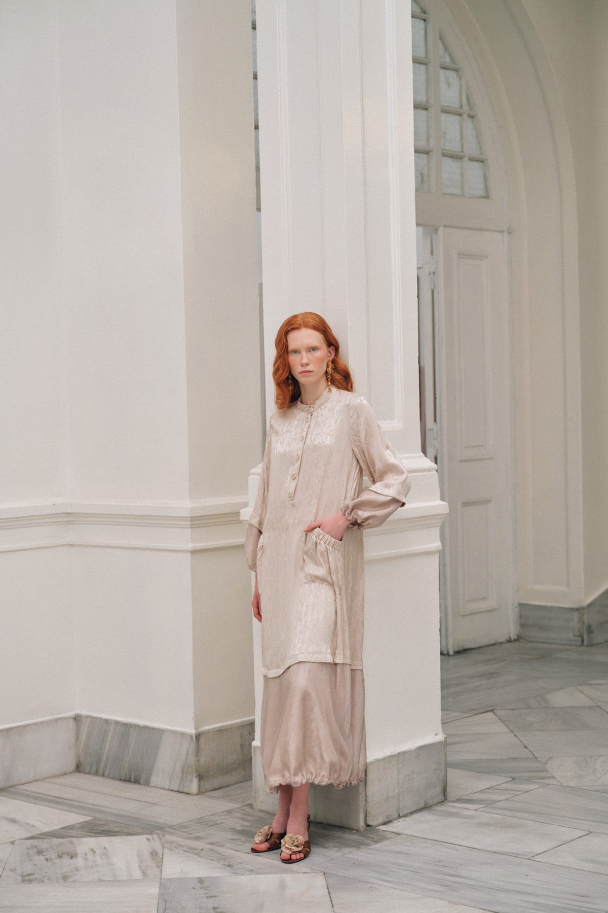 Ürün jakar ve organze kumaştan üretilmiştir. Kemeri mevcuttur. Kol ağzı ve eteği lastik ve stoper ile ayarlı büzgülüdür. Ürün astarsızdır, iç göstermez.