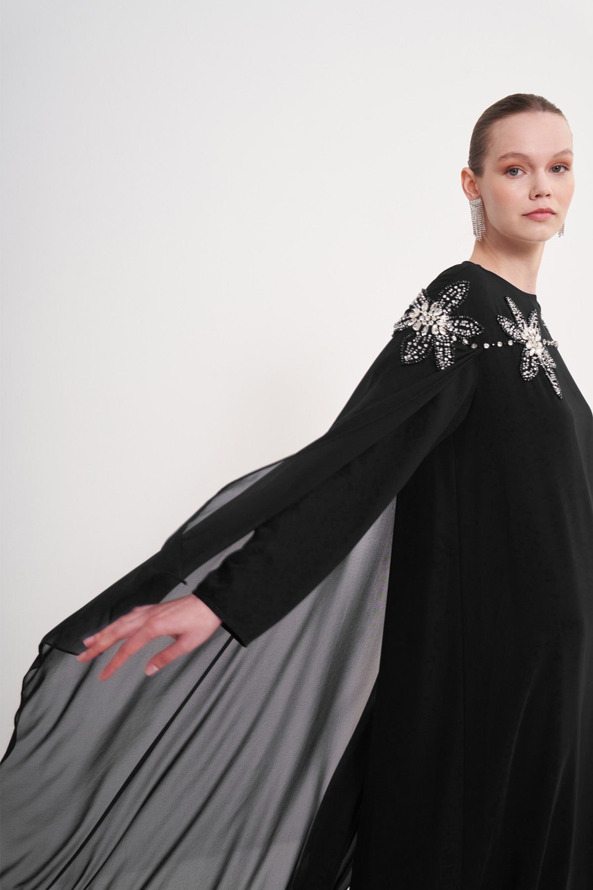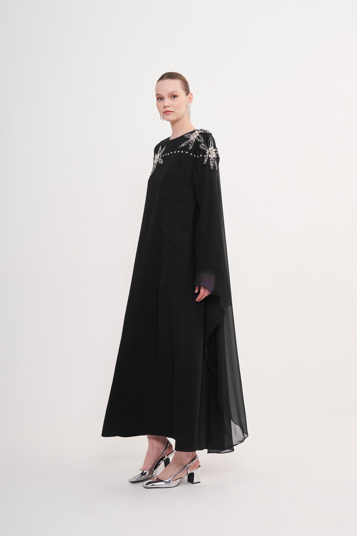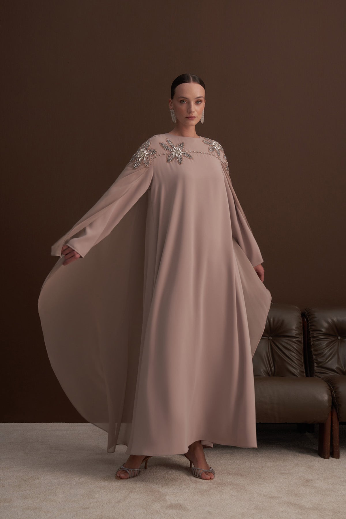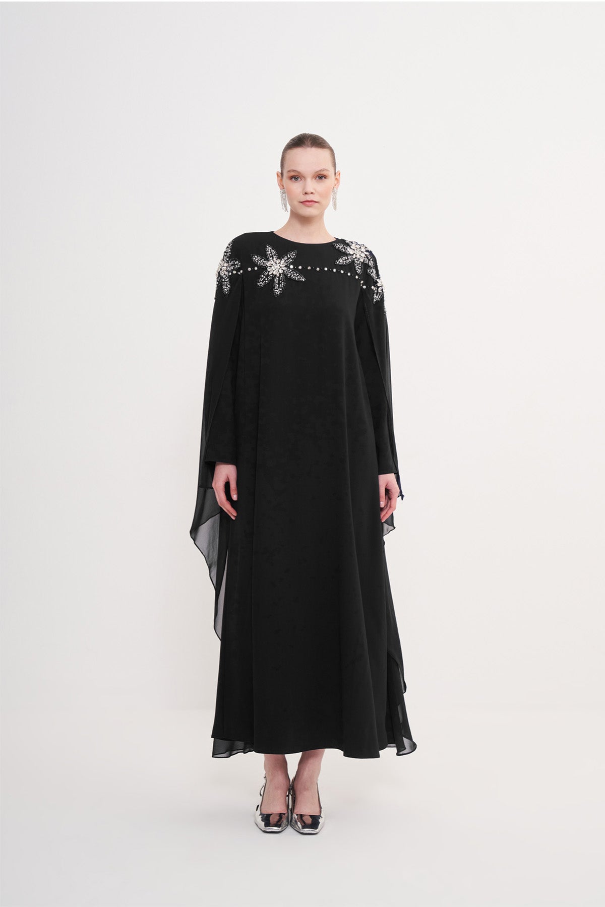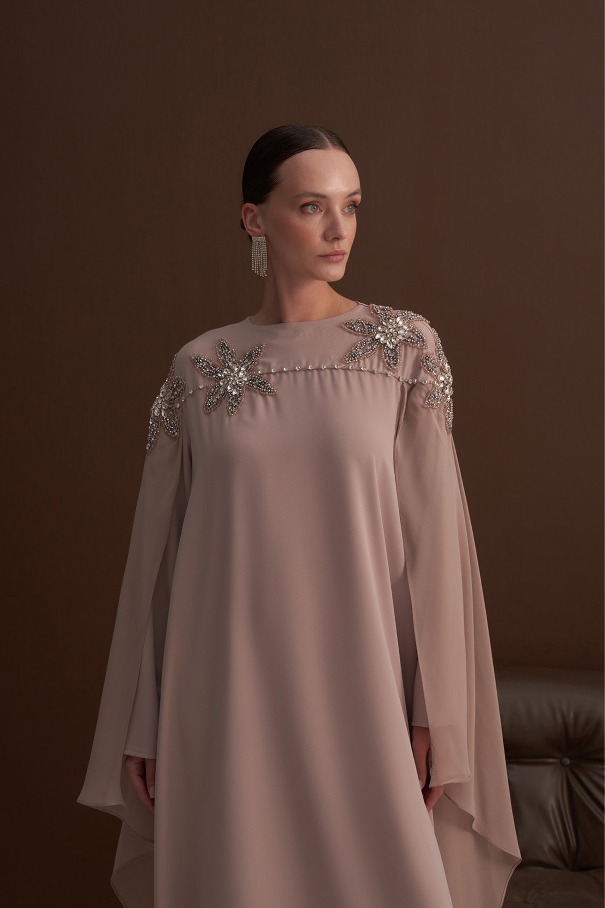 Ürünümüz krep kumaştan üretilmiştir. Pelerini şifon kumaştan üretilmiştir. Taş ve boncuk detayları el işidir. Pelerini sadece omuzlardadır. Kemeri mevcuttur.