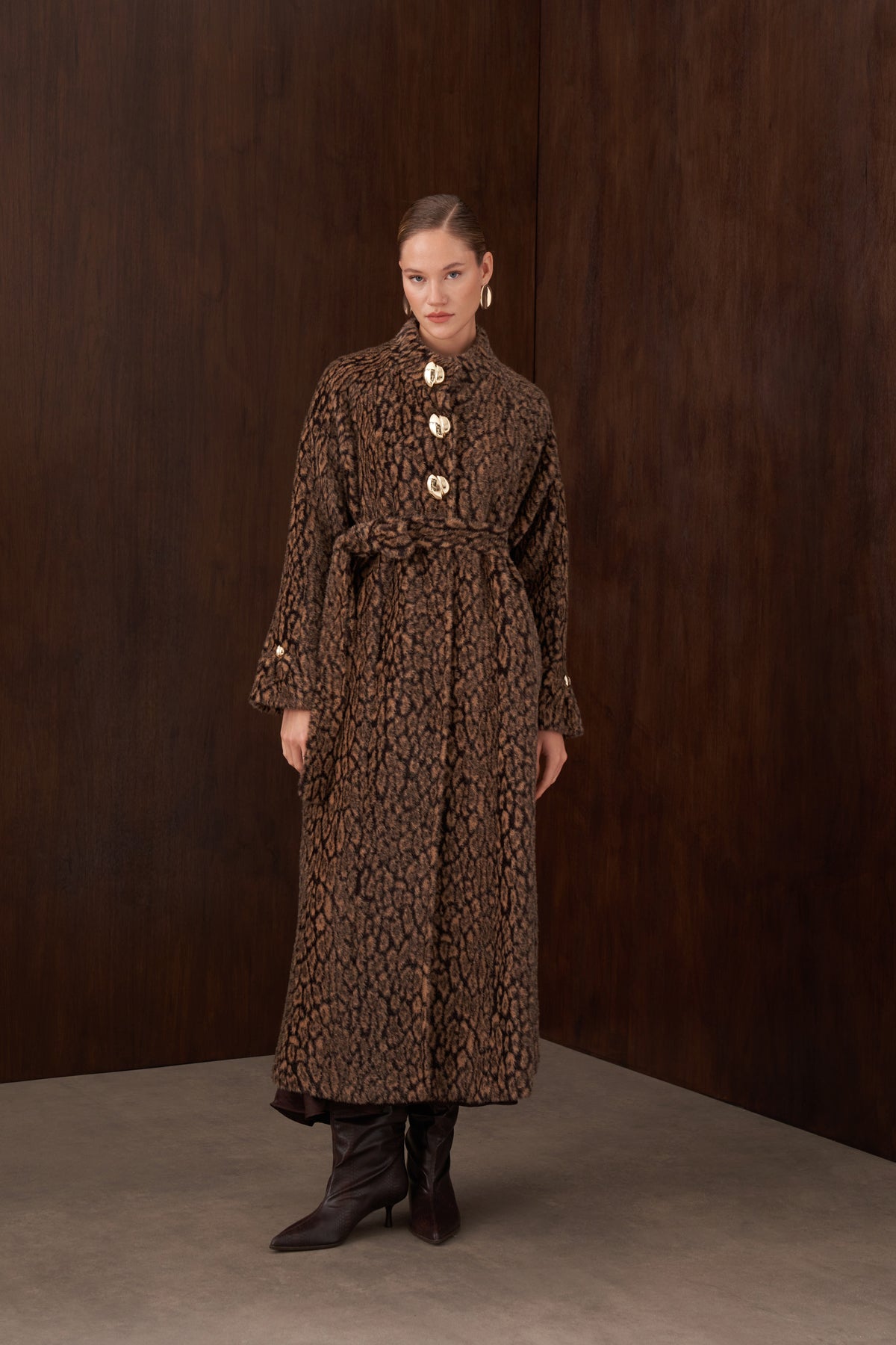 Ürün Angora kumaştan üretilmiştir. İçi boydan astarlıdır. Yan cepleri vardır. Düğmeler aksesuar amaçlıdır, önü çıtçıt ile kapanmaktadır. Angora kumaştan seyyar kemeri mevcuttur.
