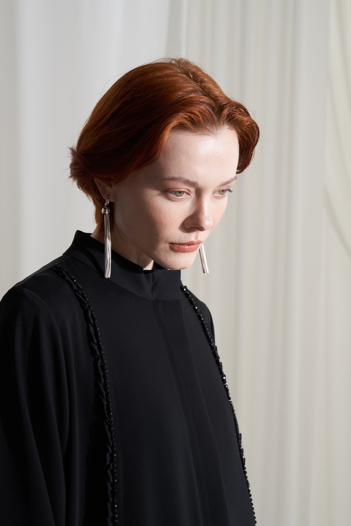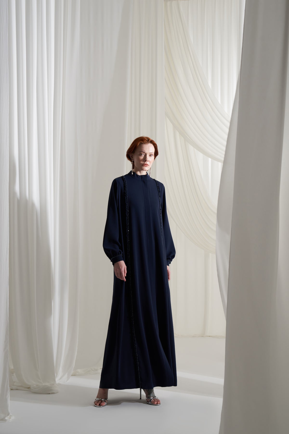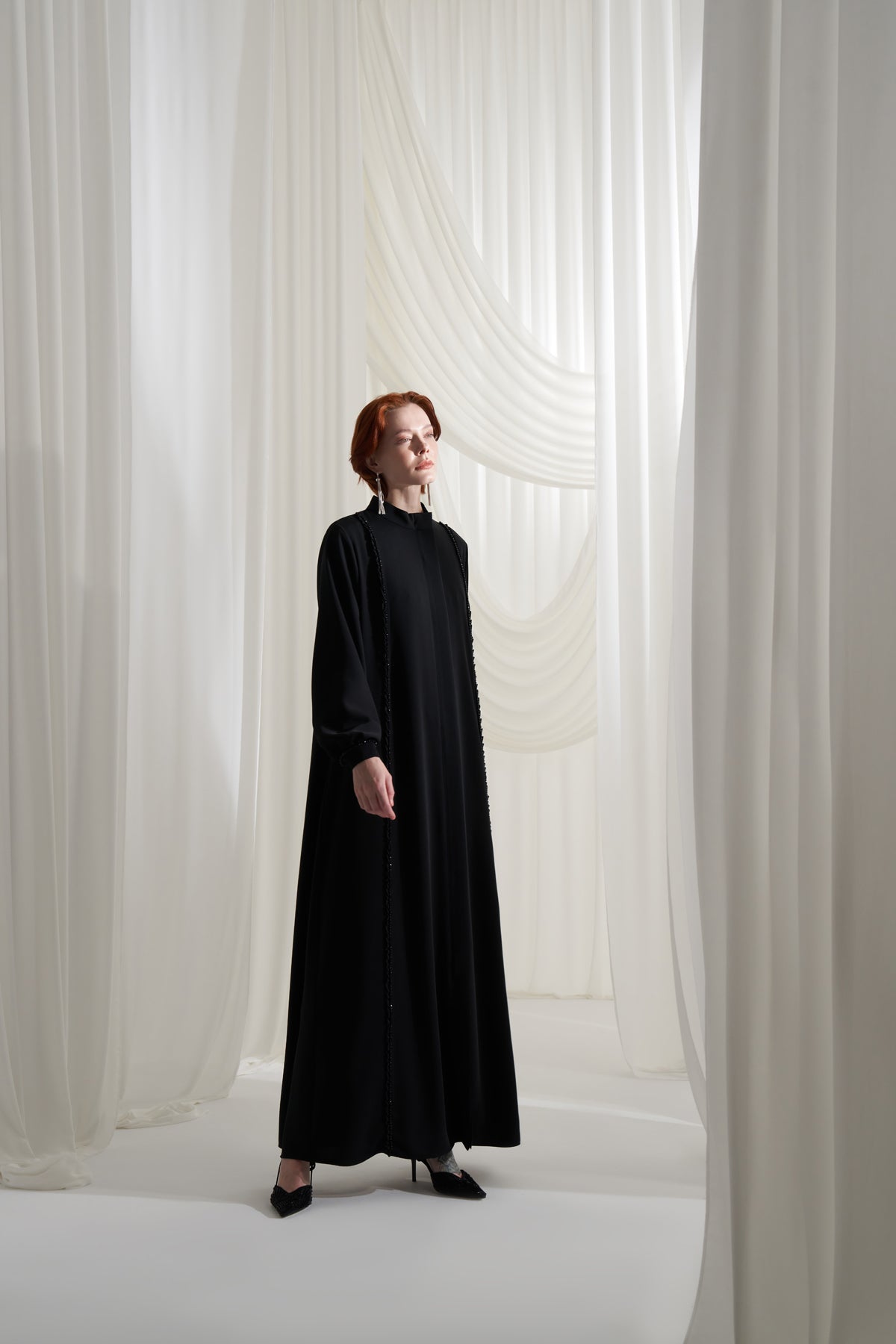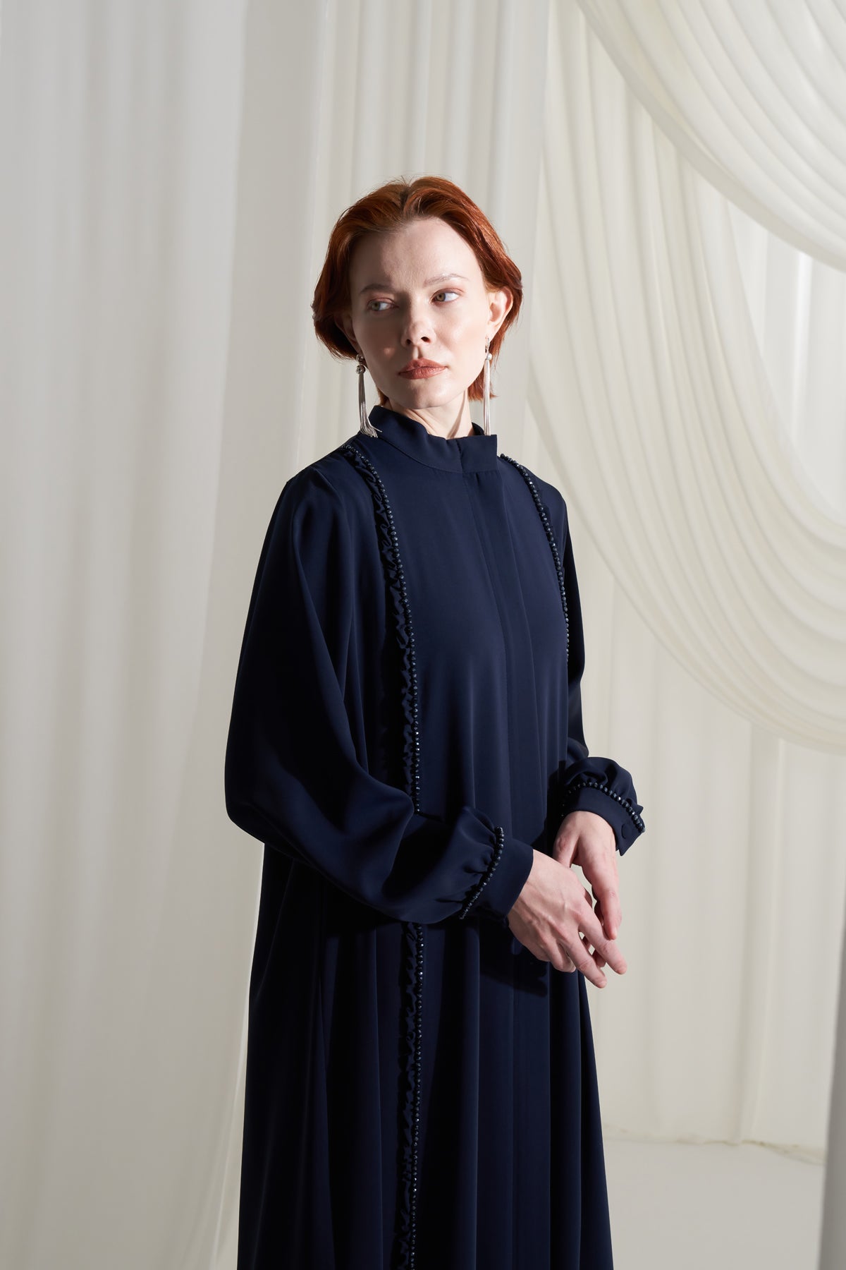 Ürünümüz krep kumaştan üretilmiştir, iç göstermez. Boncuk detayları elişi işlemedir. Önü 110 cm fermuar ile, kol ağzı manşetli ve tek düğme ile kapanmaktadır.