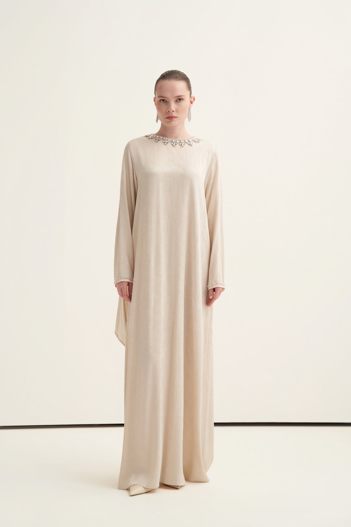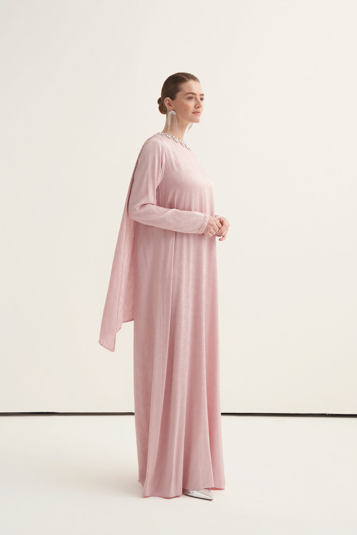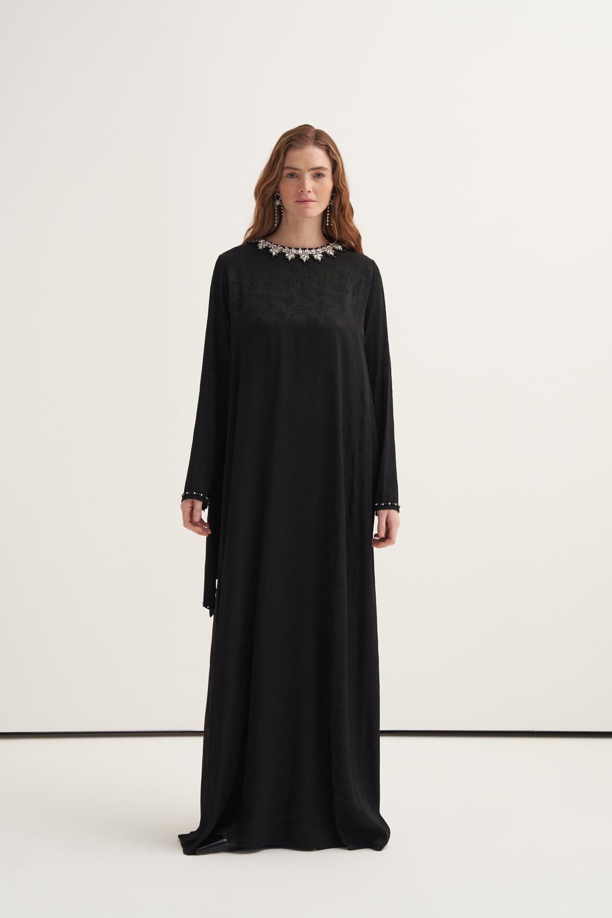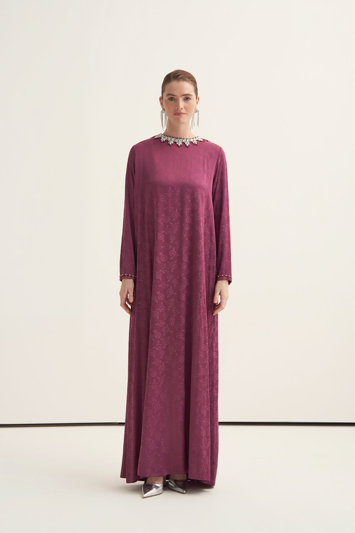Yakası Taş İşlemeli Çiçek Desen Kumaşlı Elbise