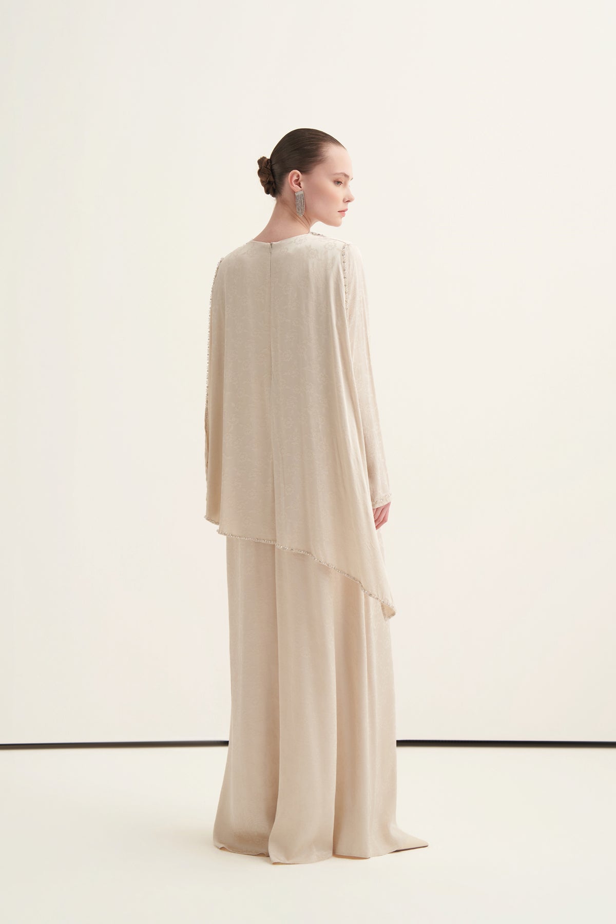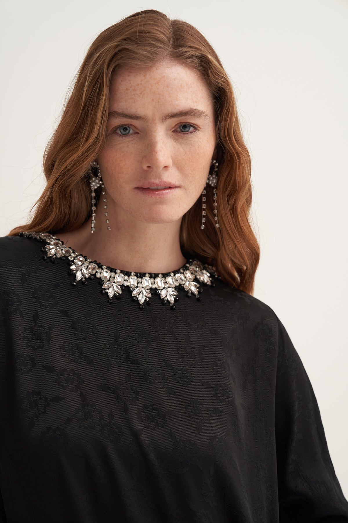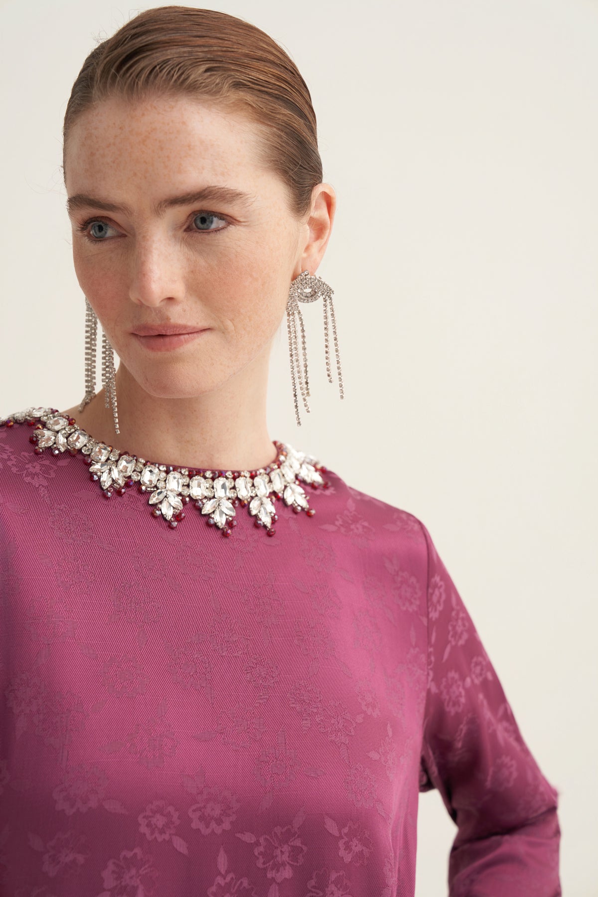 Yakası Taş İşlemeli Çiçek Desen Kumaşlı Elbise