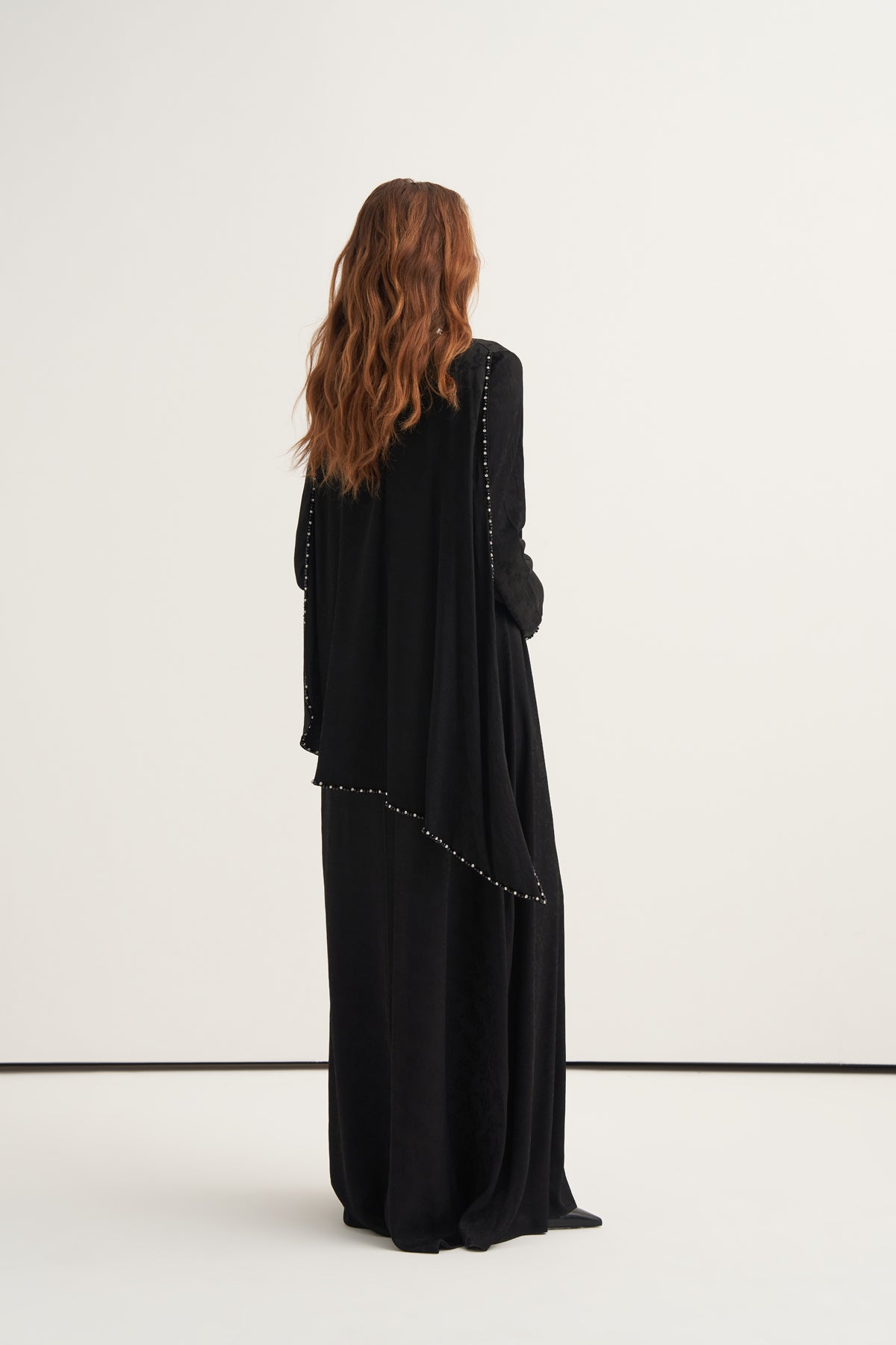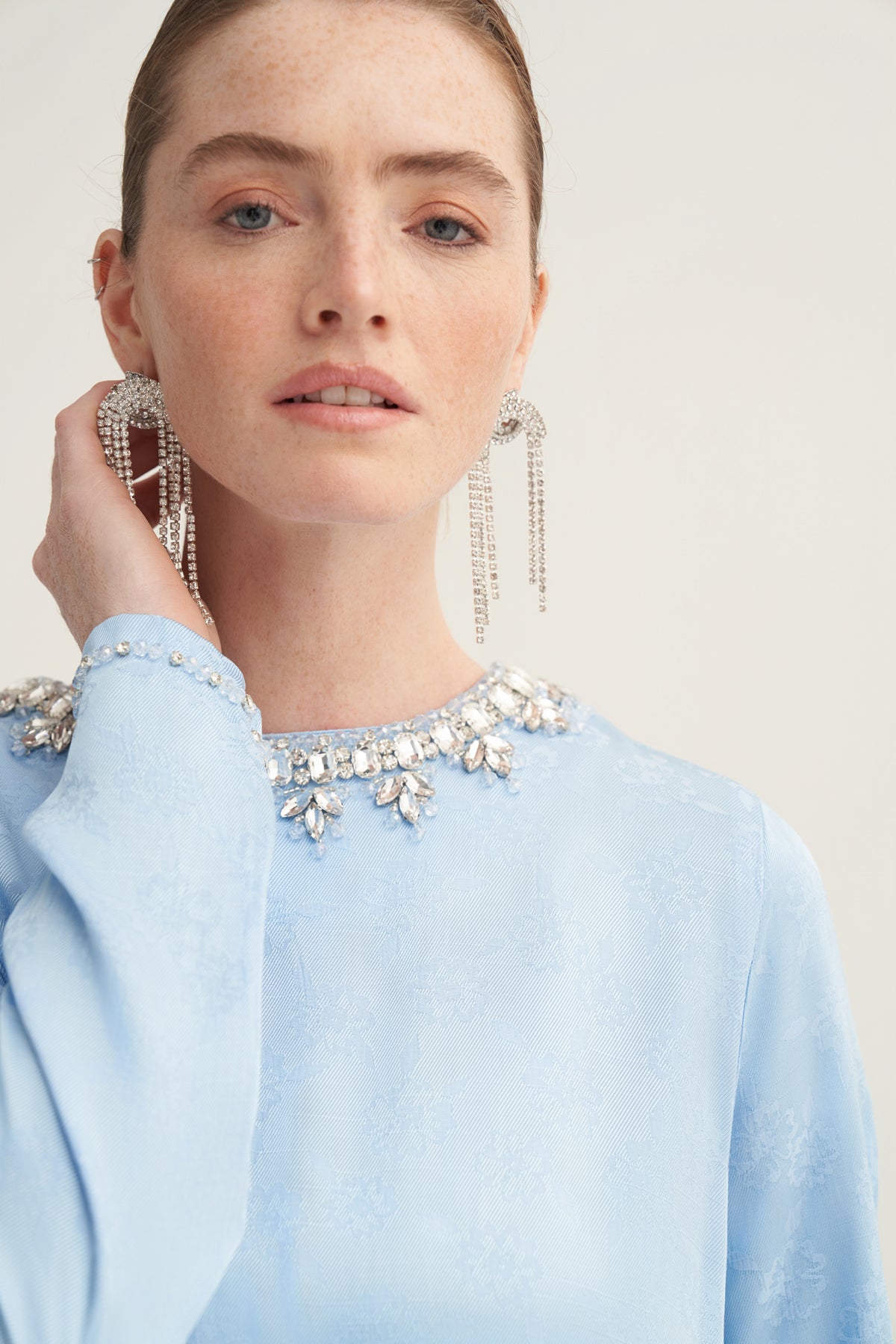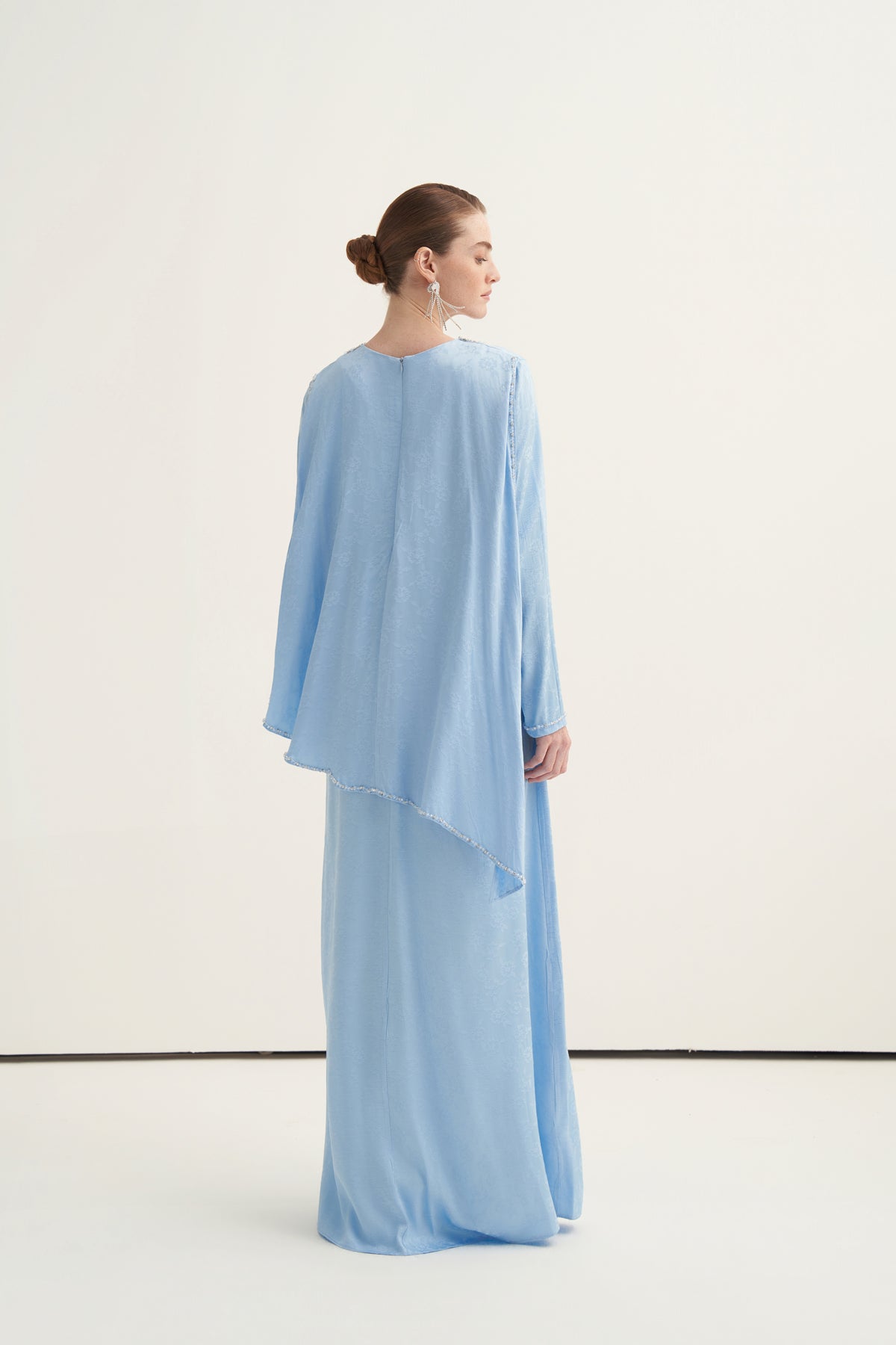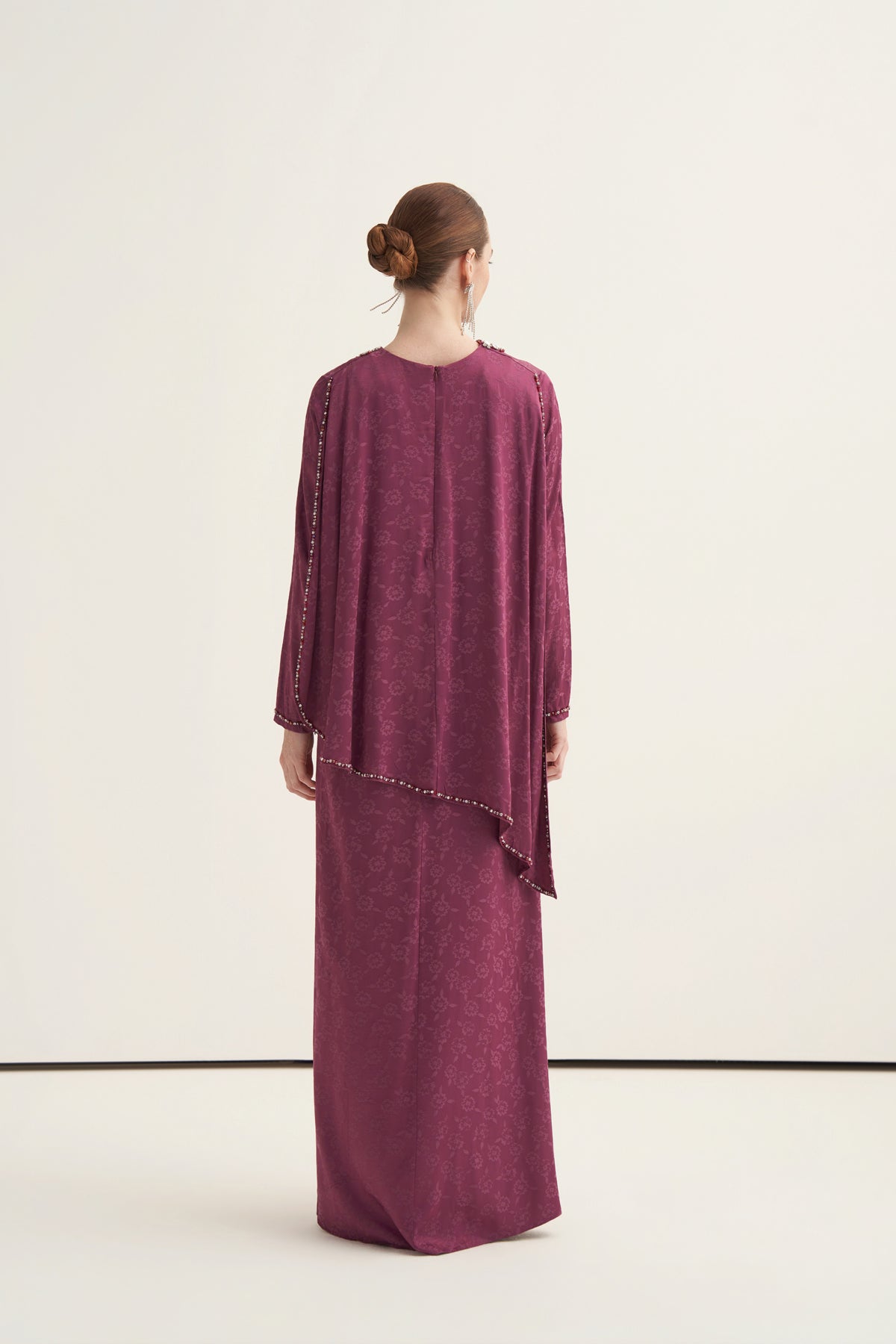 Yakası Taş İşlemeli Çiçek Desen Kumaşlı Elbise