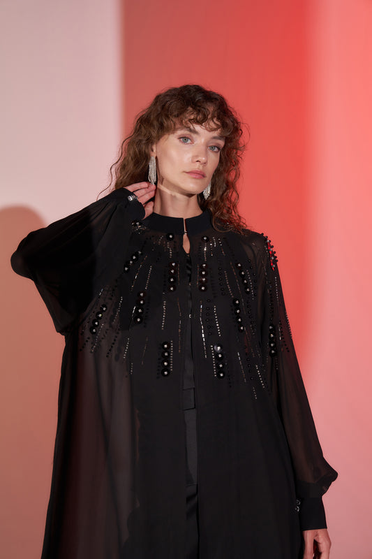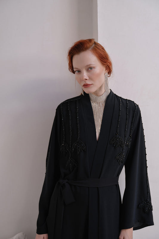 Kol ve Ön Arka El İşi Boncuk İşlemeli Abaya - Siyah
