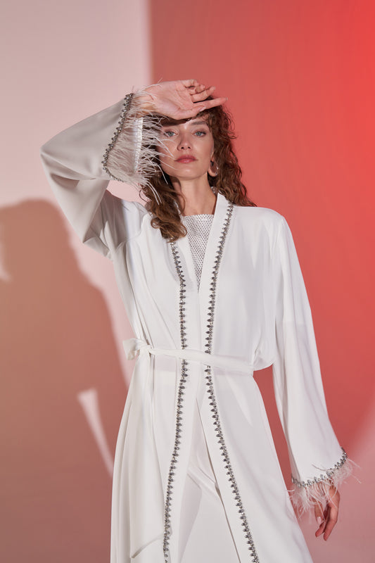 Yakası Ve Kol Uçları Taş İşlemeli Tüy Detaylı Abaya - Ekru