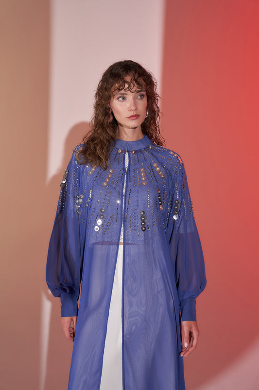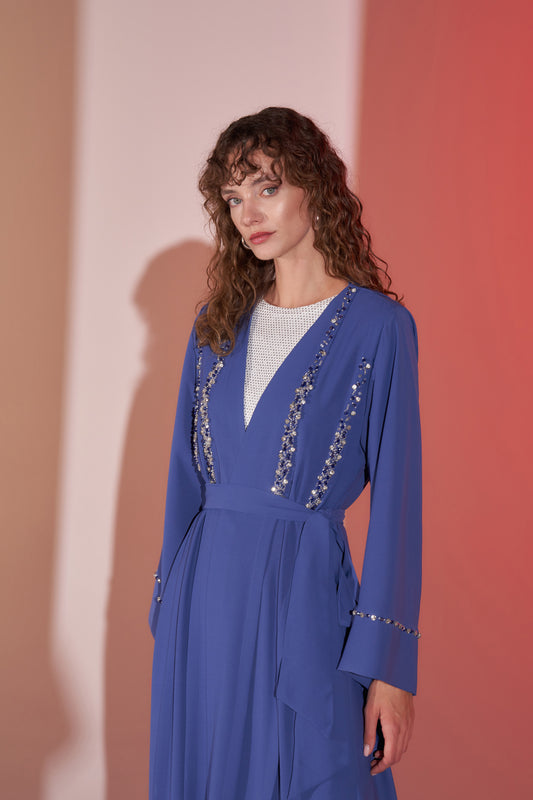 Omuz Boncuk İşleme Detaylı Etek Yanları Şifonlu Abaya - Mavi