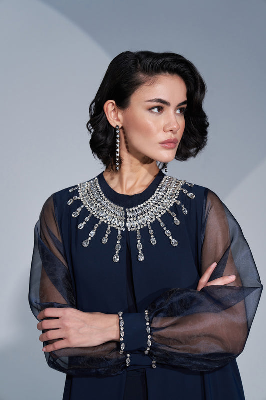 Kol Uçları ve Yaka El İşi Taş İşleme Detaylı Abaya - Lacivert