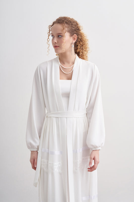 Dantel Ve Şerit Detaylı Abaya - Ekru