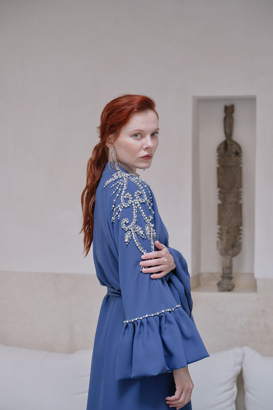 El İşlemeli Taş Detaylı Abaya - Mavi
