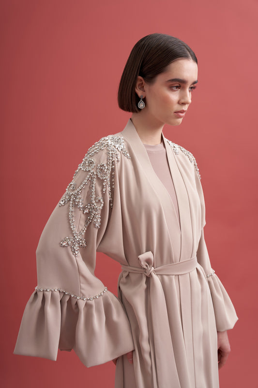 Balon Kol Omuzu Taş Detaylı Abaya - Bej