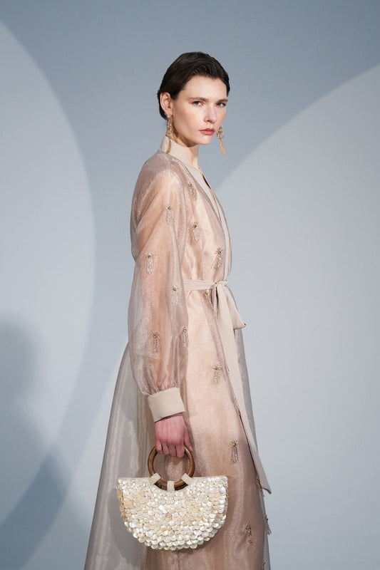 Boncuk İşleme Detaylı Organze Ceket Yaka Abaya - Bej
